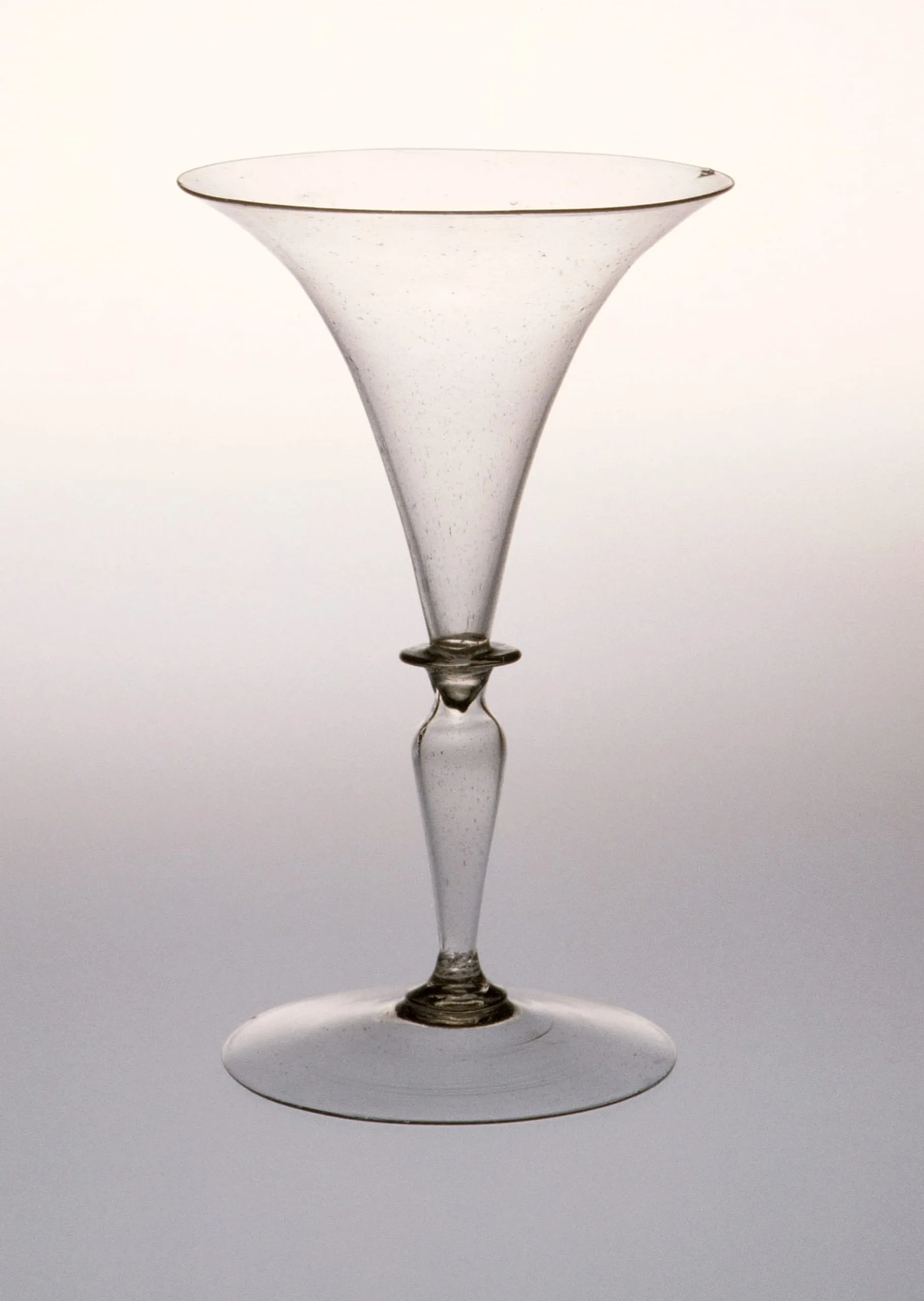Blown glass goblet with wide trumpet-shaped bowl, elongated stem with oval knop, and broad flat foot, nearly colorless with faint smoky tint
