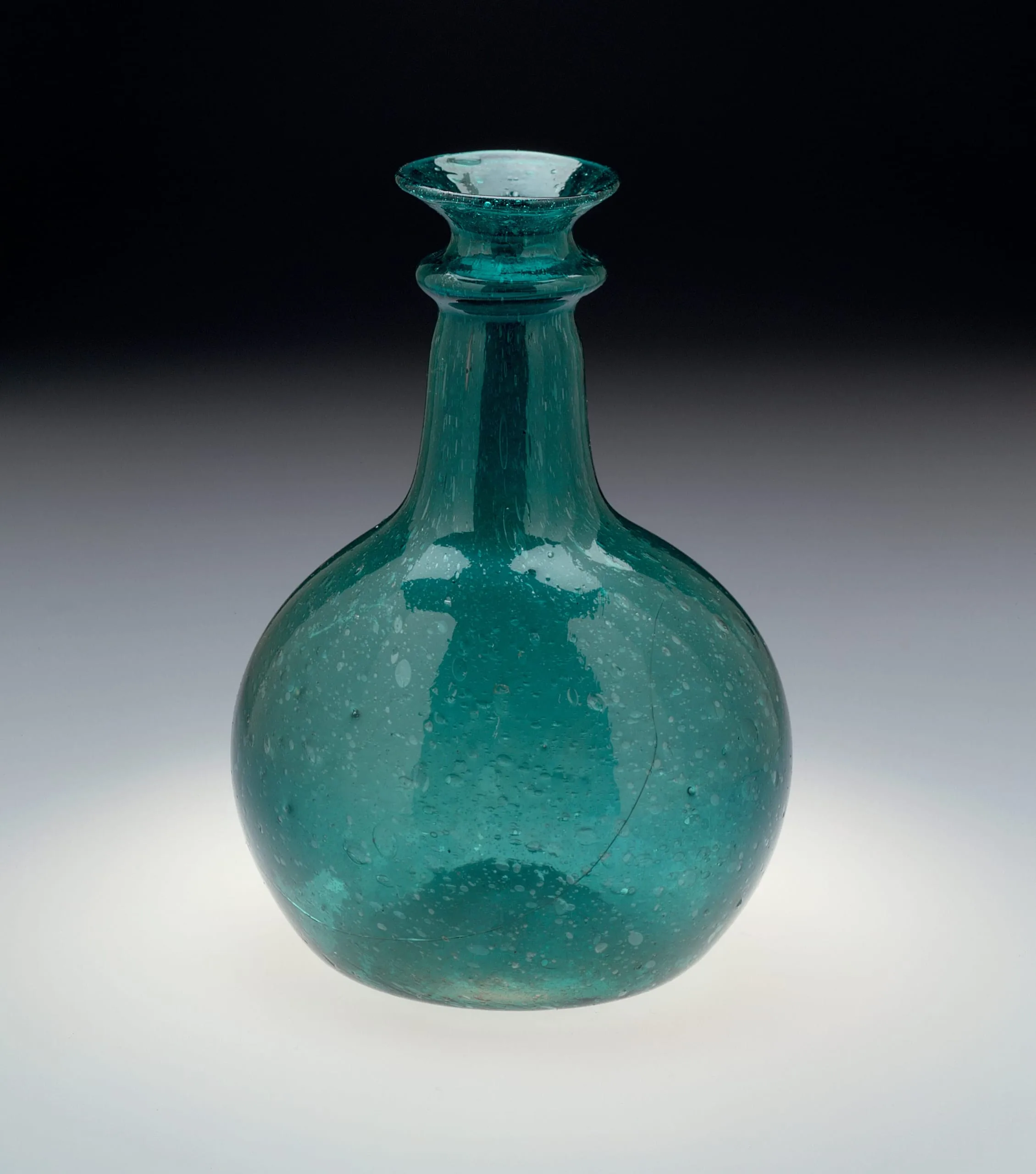 This peacock blue flask has a bulbous body and a slightly tapering stout neck with a ring molding near the mouth and an everted rim. It is reminiscent of unguent vessels found throughout the ancient world and South Asia. Unguents are topical preparations for skin injuries or massage therapy. A multitude of herbal unguents are described in literary accounts, such as in the early 12th-century Sanskrit treatise, the Manasollasa.