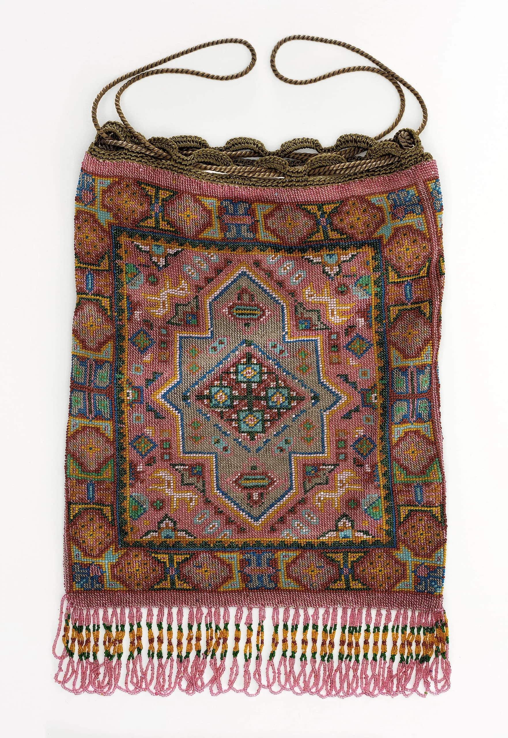 Beaded evening bag with carpet-style geometric medallion pattern in mauve-rose, cobalt blue, teal, and gold, with braided trim at top and pink beaded fringe at bottom
