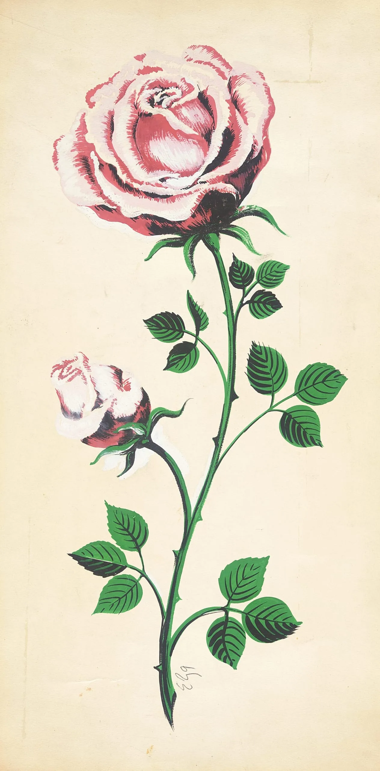 Drawing of a rose stem in ink and color on cream paper, featuring one large open bloom in crimson and white and one smaller bud, with dark green leaves