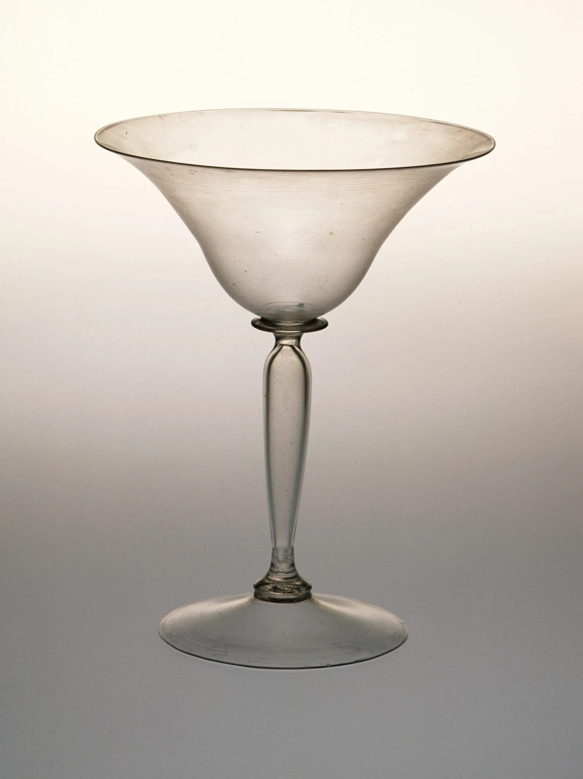 Hand-blown glass goblet with a wide, funnel-shaped bowl, slender stem with small knops, and a flat circular foot, nearly colorless with a faint gray-green tint
