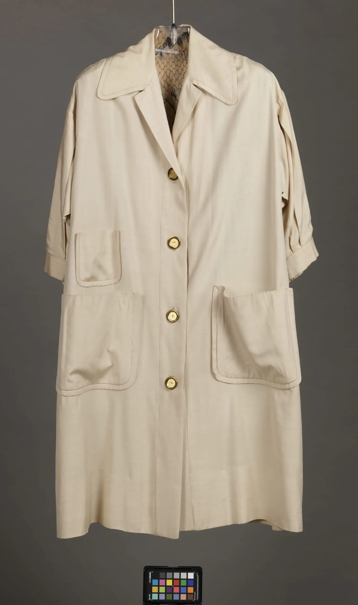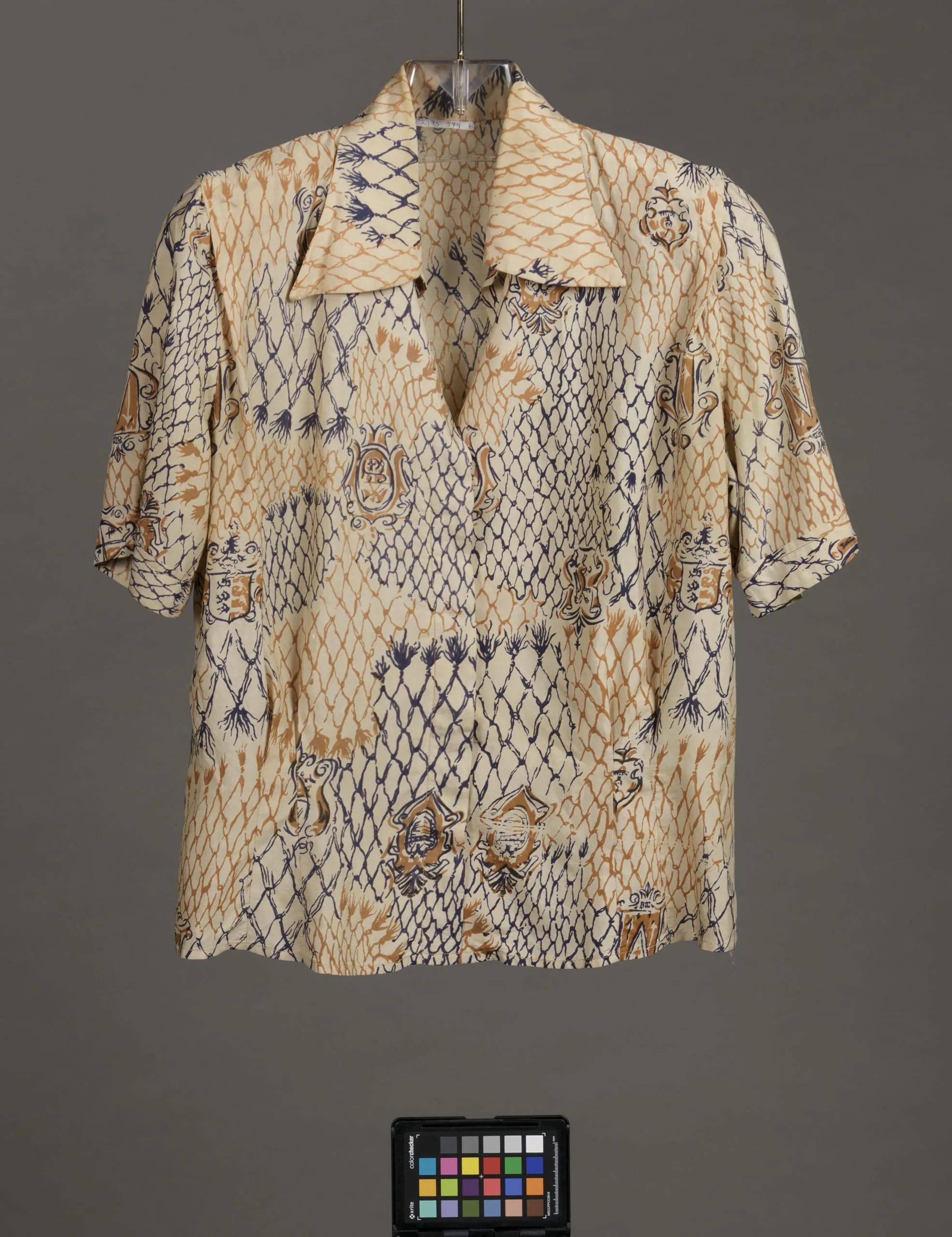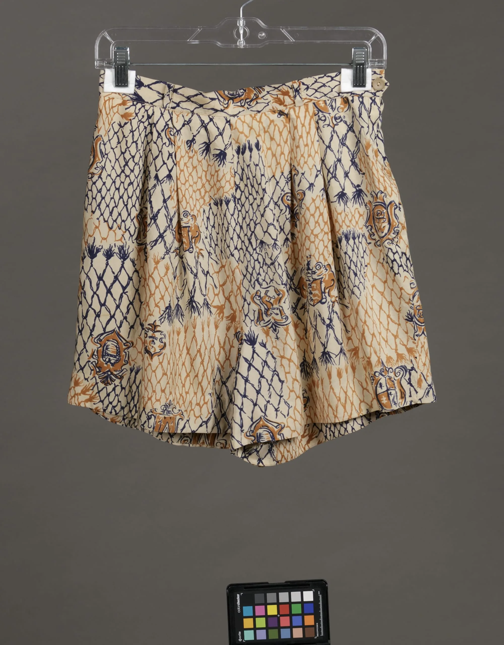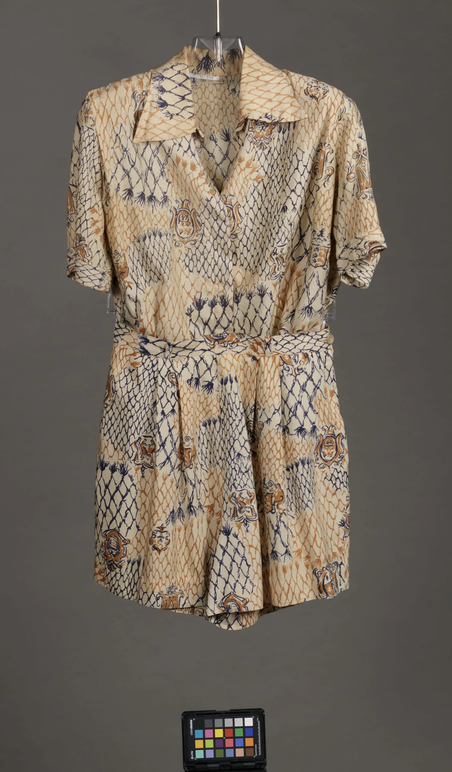 - Blouse and Shorts: rayon plain weave, printed; Coat: rayon plain weave with metal buttons; Belt: Raffia plain weave and cotton plain weave