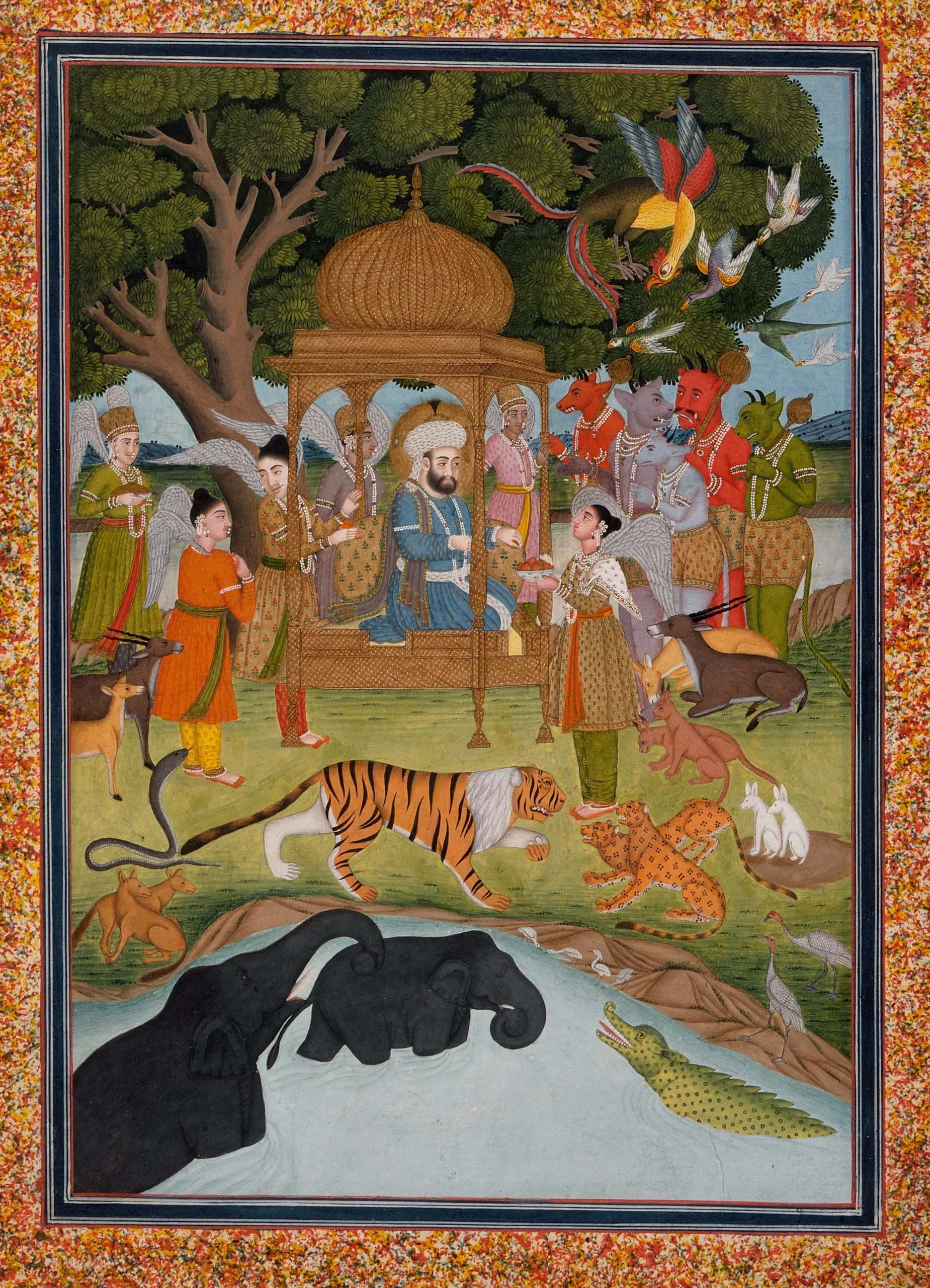 The title of this painting is inscribed on the reverse: “Picture of the Throne of His Majesty Prophet Solomon.” The nimbate Solomon is enthroned in a golden domed pavilion. He is attended by a group of a winged angels in contemporaneous garb. One angel offers him fruit in a blue and white ceramic bowl, while another angel carries a blue and white bowl with a bejeweled golden lid. Various pacified animals gather beneath him, including a liger in the foreground and a Persian mythological simurgh flying above. A phalanx of subjugated demons pay homage before him. The composition is enlivened by the interaction between the angels, the interaction between the demons, and the interaction between the animals.