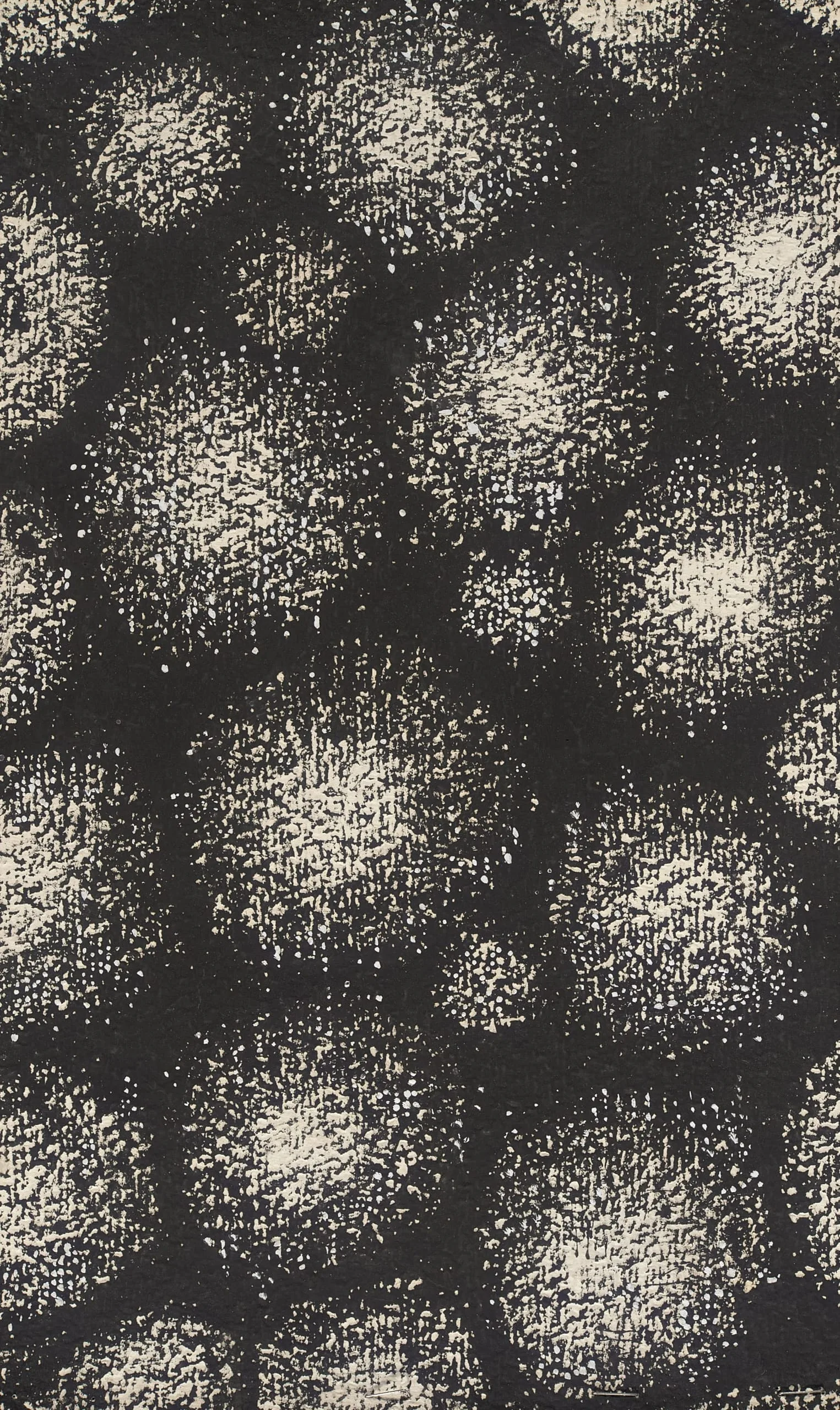 Vertical print with allover pattern of rounded, cream-colored forms against a near-black ground, created with grainy, frottage-like texture