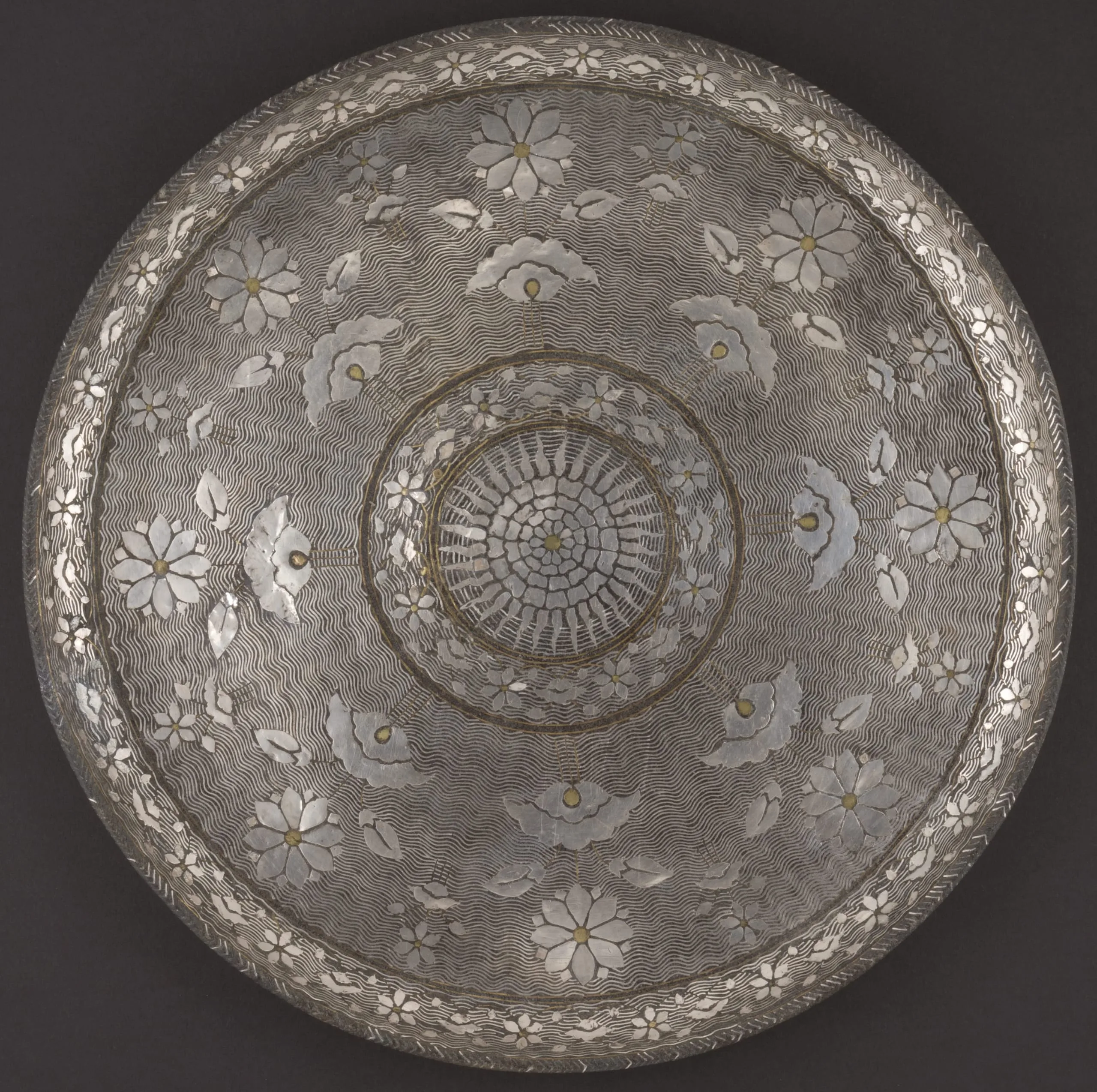 This lyrically rhythmic tray (thali) is decorated with silver wire and silver sheet inlay, and small accents of brass used to define and highlight select elements of the composition. The central medallion is a radiant sun-burst motif in silver sheet with a brass center. It is encircled by a band of lotus scrolling. Undulating strands of silver wire are used over the entire surface of the tray to represent the rippled waters of a pond, which emanate concentrically from the central medallion like the waves from a rock tossed in a pond. Eight large blossoming lotus plants formed by sheet inlay alternate with eight smaller lotuses in a more subtle than usual spoked arrangement often found on bidri-ware trays. Brass sheet is used for the stamen-like center and brass wire for the stem of the lotus flowers. The tray’s low lip repeats the lotus scroll found on the band around the central medallion.