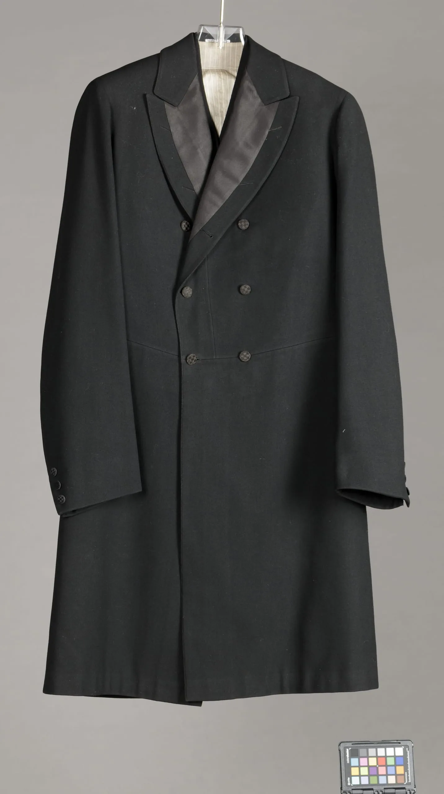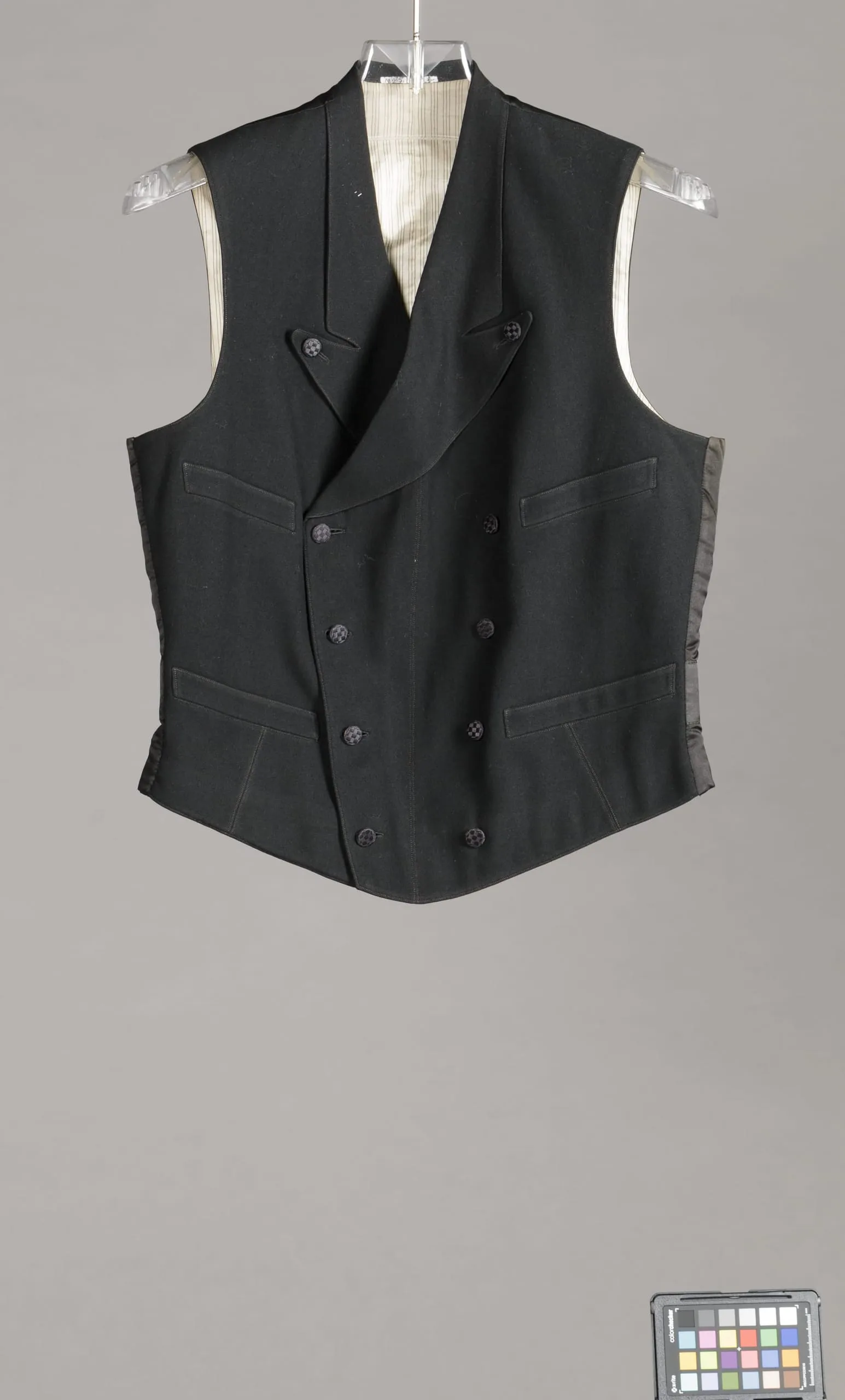 - Coat: wool twill, fulled, with silk twill and silk thread-covered buttons; Vest: wool twill, fulled, with silk thread-covered buttons