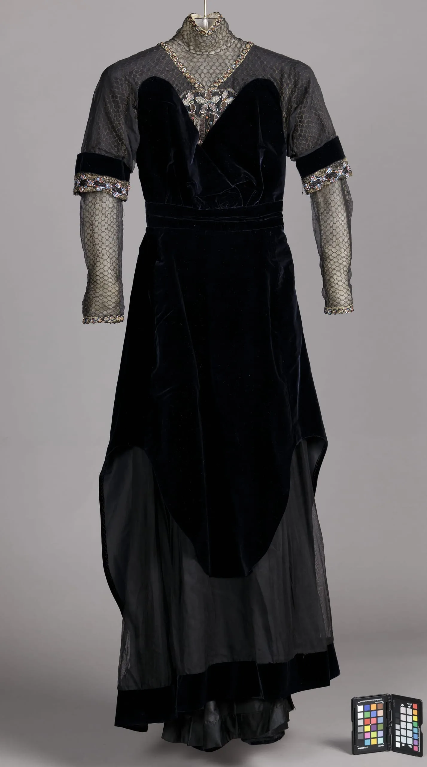 - Silk velvet and silk gauze with metallic-thread net, metallic-thread embroidery and glass beads