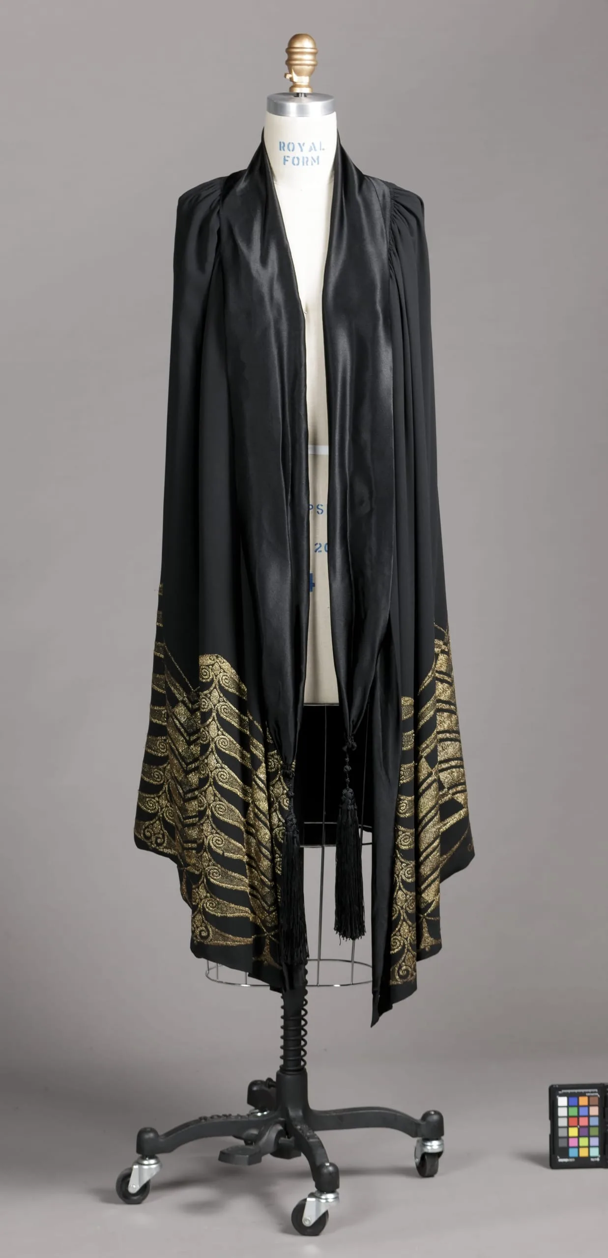 - Silk plain weave (crepe) with metallic thread supplementary-warp patterning and silk tassels