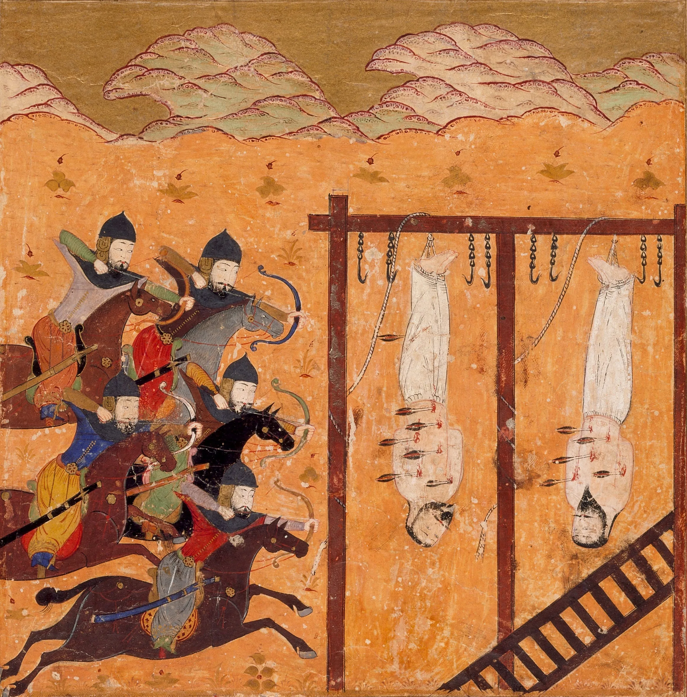 Here, two men hung upside down from a gibbet are being shot with arrows by archers galloping on horseback. Neither the prisoners’ identity nor the specific incident can be determined because the painting has been detached from its text and remounted. A similar scene of two lifeless men hanging upside down from gallows, albeit without the mounted archers or protruding arrows in the corpses, depicts the execution of two murderers by Alexander the Great (Iskandar) in a Shahnama of 1482 from Shiraz, Iran, now in the Metropolitan Museum of Art, New York (40.38.1). Another similar scene of two dead men hung by the neck from gibbets and shot by archers on foot by the Sasanian King Ardeshir (r. 224-242) is in a Shahnama of 1486 from Shiraz, now in the Nasser D. Khalili Collection of Islamic Art (MSS 713, fol. 437v). Neither scene matches the LACMA painting, in which the men are still alive, indicated by their open eyes, and the execution is underway.