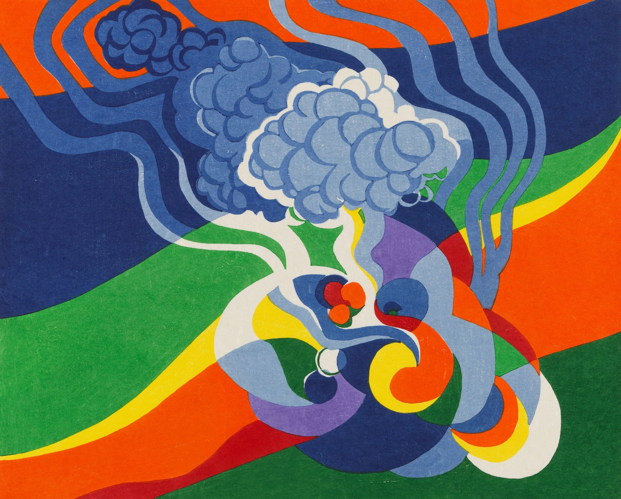 When Macdonald-Wright was seventy-five years old, he created twenty color woodblock prints of Haiga, an image illustrating a haiku (seventeen syllable, three-line poems that do not rhyme). The portfolio illustrates haiku by some of Japan's most revered poets: Basho, Buson, Issa, Shiki, Chiyoni, and Hokushi. Each Haiga's title is a translation of the haiku. The Haiga portfolio prints affirmed one of the fundamental precepts of Synchromism: art must draw inspiration from both past and present to be vital and enduring. The Haiga images also testify to Macdonald-Wright's unceasing commitment to bridging East and West.