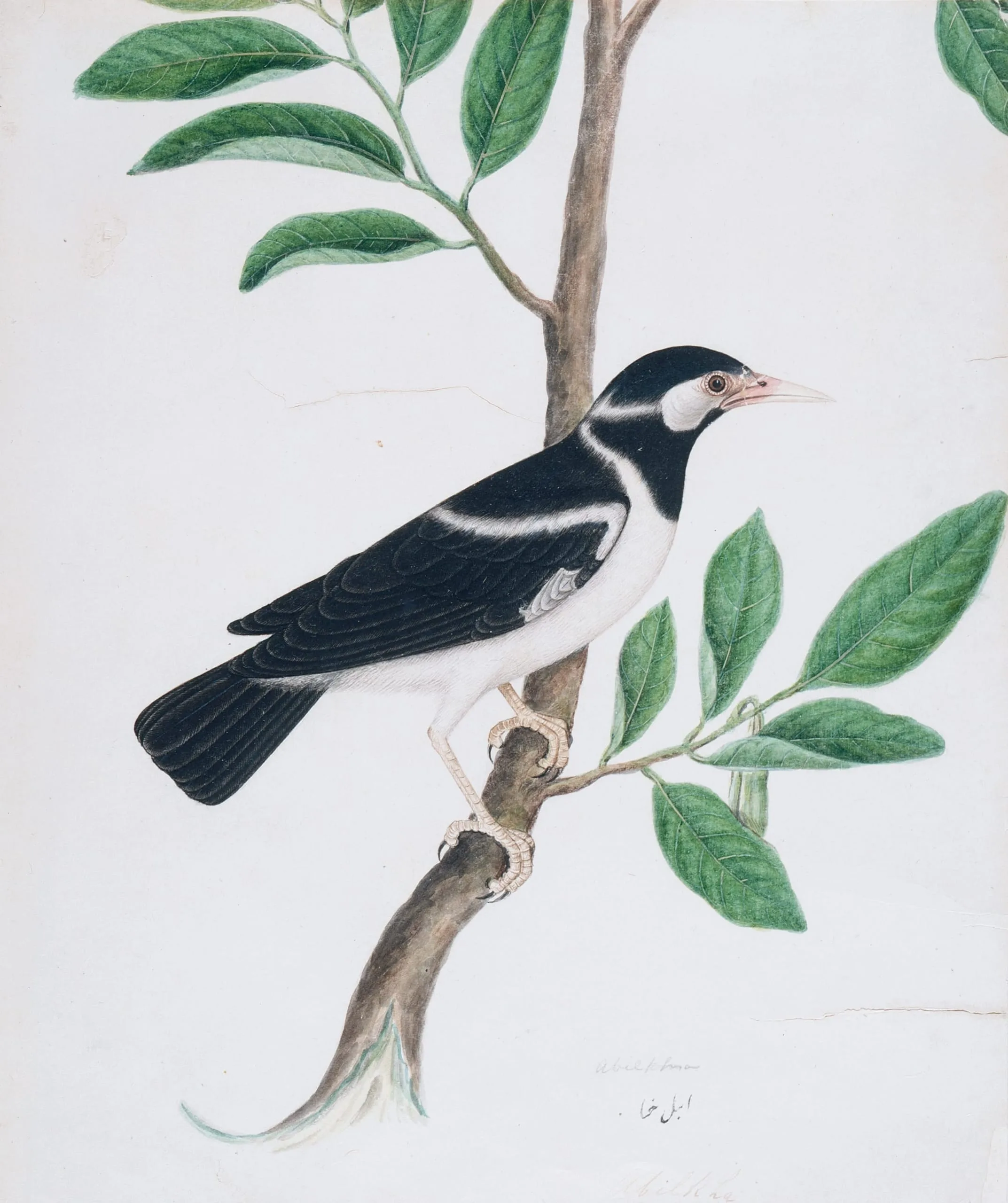 Painted with great finesse, this painting of a Pied Myna exemplifies the blending of Mughal and European artistic sensibilities and is an excellent example of the type of work patronized by the British in 19th-century Calcutta. British patrons recruited Indian court artists trained in the detailed and precise Mughal style of drawing to produce pictures of zoological and botanical subjects. The European patrons stressed acute observation in the name of scientific accuracy, as well as the Western techniques of foreshortening, shading, and perspective. The resultant nature studies were vibrant and fresh, with the same delicacy and sparkling colors that characterize the finest Mughal paintings.