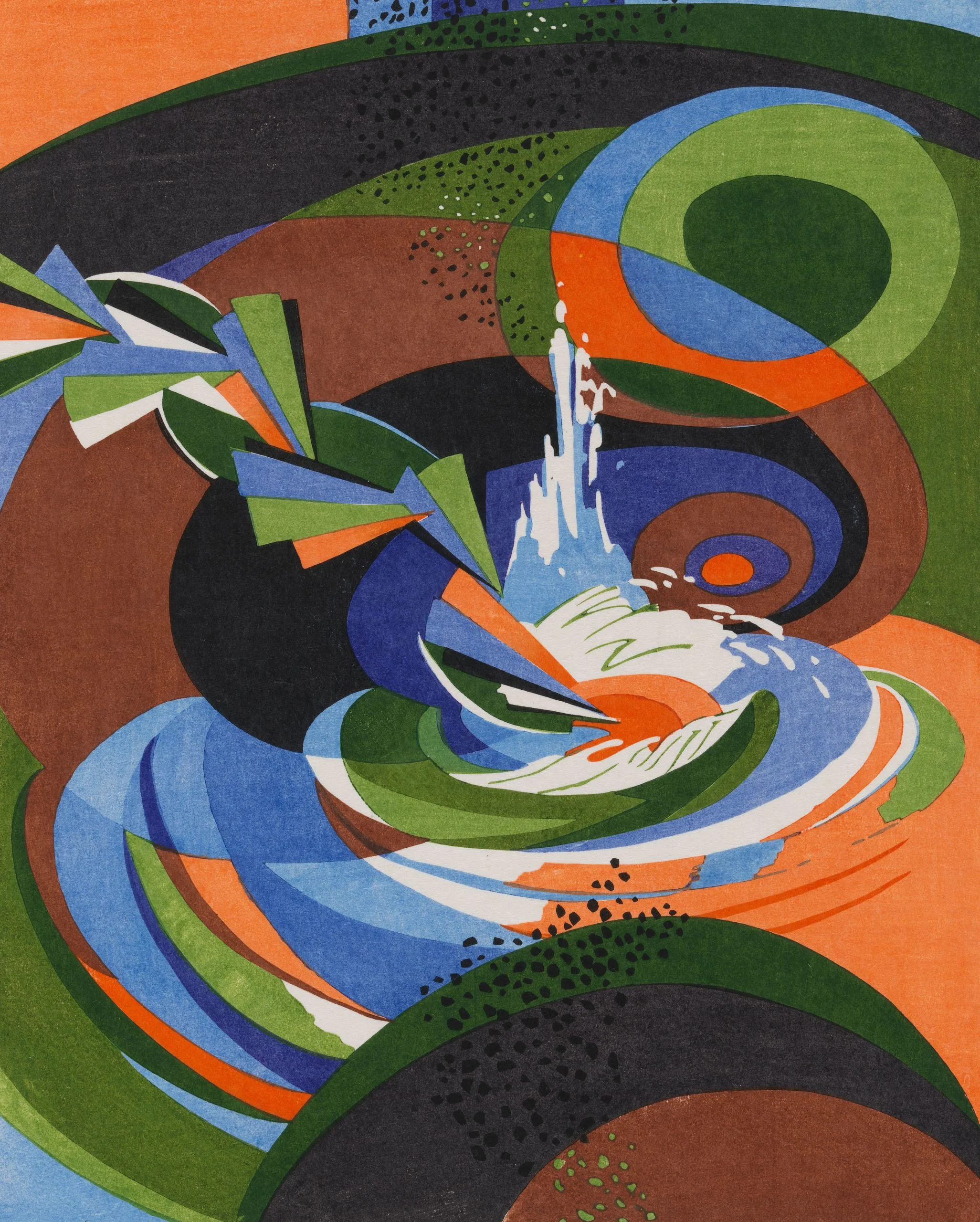 When Macdonald-Wright was seventy-five years old, he created twenty color woodblock prints of Haiga, an image illustrating a haiku (seventeen syllable, three-line poems that do not rhyme). The portfolio illustrates haiku by some of Japan's most revered poets: Basho, Buson, Issa, Shiki, Chiyoni, and Hokushi. Each Haiga's title is a translation of the haiku. The Haiga portfolio prints affirmed one of the fundamental precepts of Synchromism: art must draw inspiration from both past and present to be vital and enduring. The Haiga images also testify to Macdonald-Wright's unceasing commitment to bridging East and West.