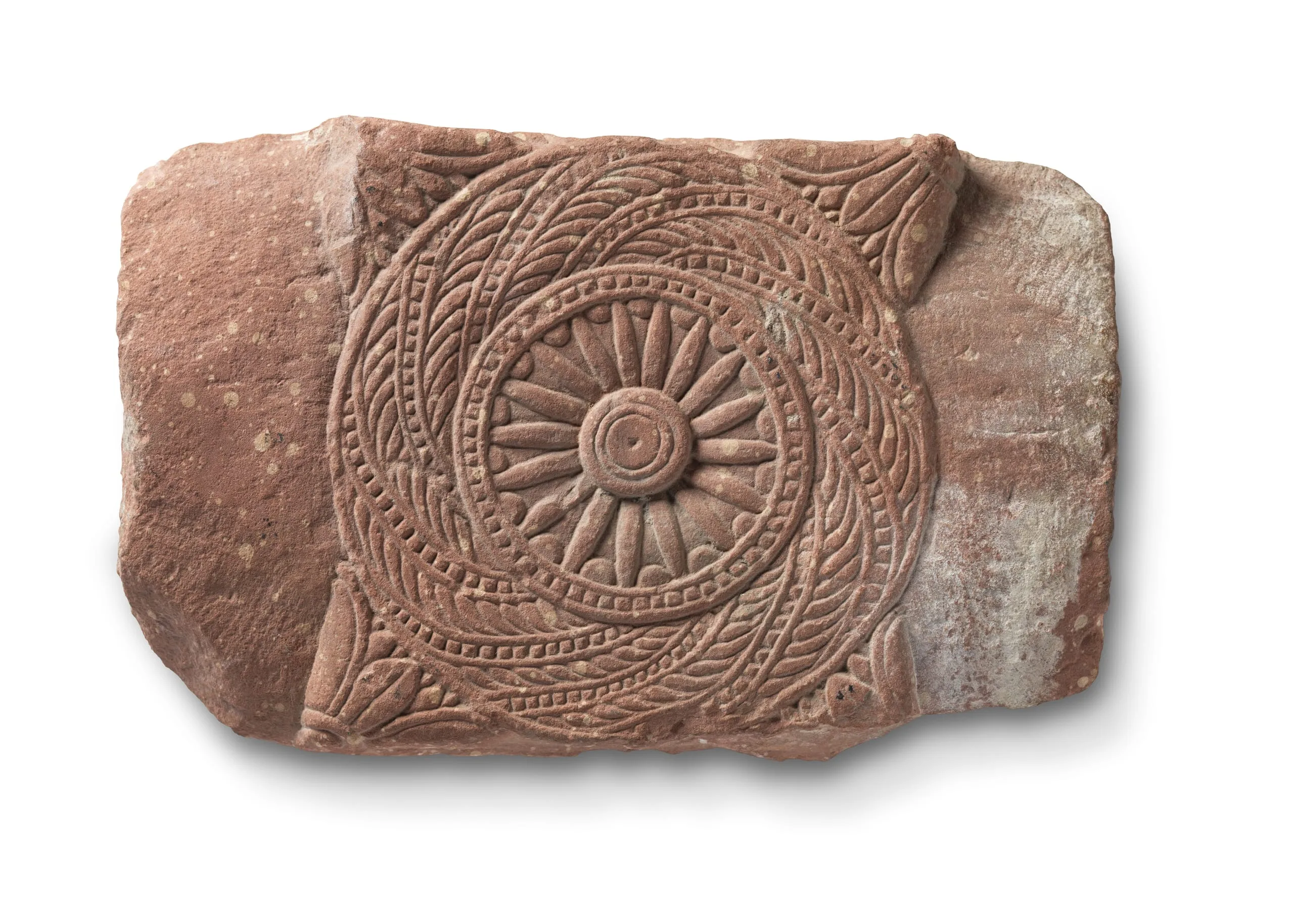 This crossbar (suchi) originally served to connect the pillars (thaba) of a railing (vedika) enclosing a Buddhist stupa (funerary monument) in Mathura, Uttar Pradesh. The railing pillars were typically adorned with voluptuous females symbolizing abundance and fertility (see M.78.9.16 and M.85.2.2). The figural pillars were often alternated with pillars festooned with lotus medallions and half-medallions. An ornamented copestone connected the railing sections (see M.81.90.21a-b). See a complete section of a comparable Mathura railing in the Cleveland Museum of Art (1943.71). The earliest Buddhist stupas held the Buddha’s ashes and relics, but later ones also interred the remains of the Buddha’s renowned acolytes or commemorated significant sites or events in the life of the Buddha.