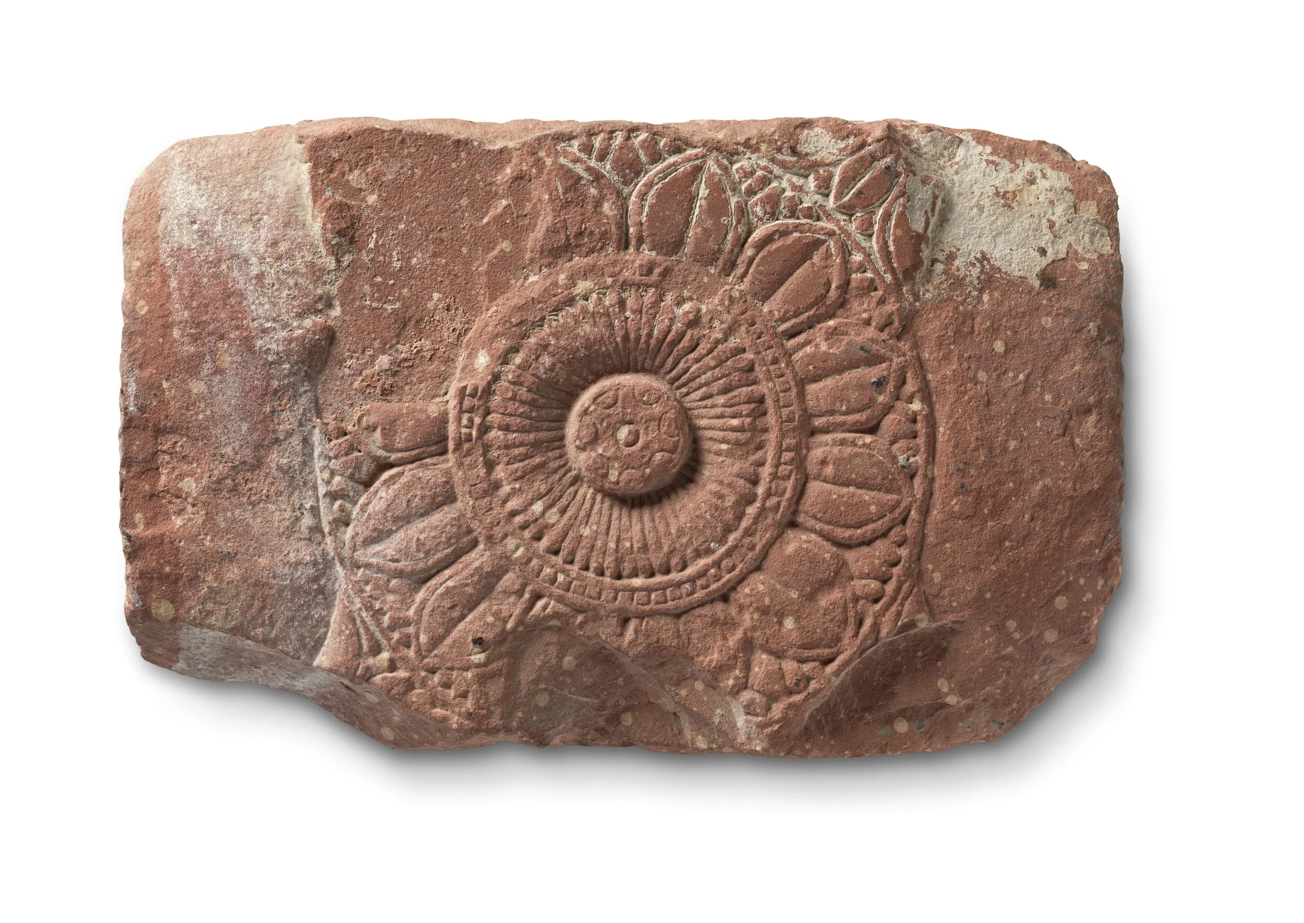 Verso: This side bears a standard lotus medallion that once had twelve petals surrounding the gynoecium containing the pistil and stamens. Like the recto, the four vertices are graced with lotus blossoms.