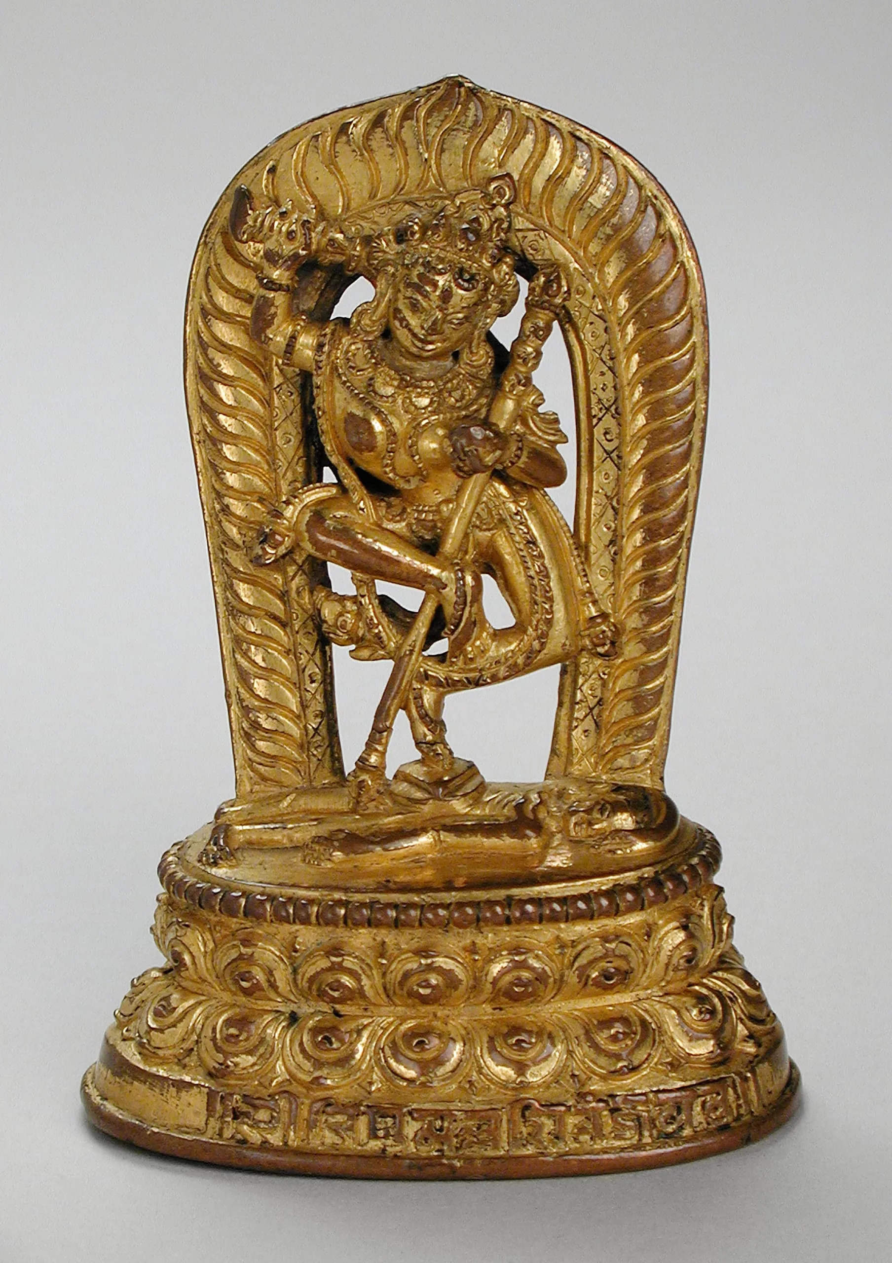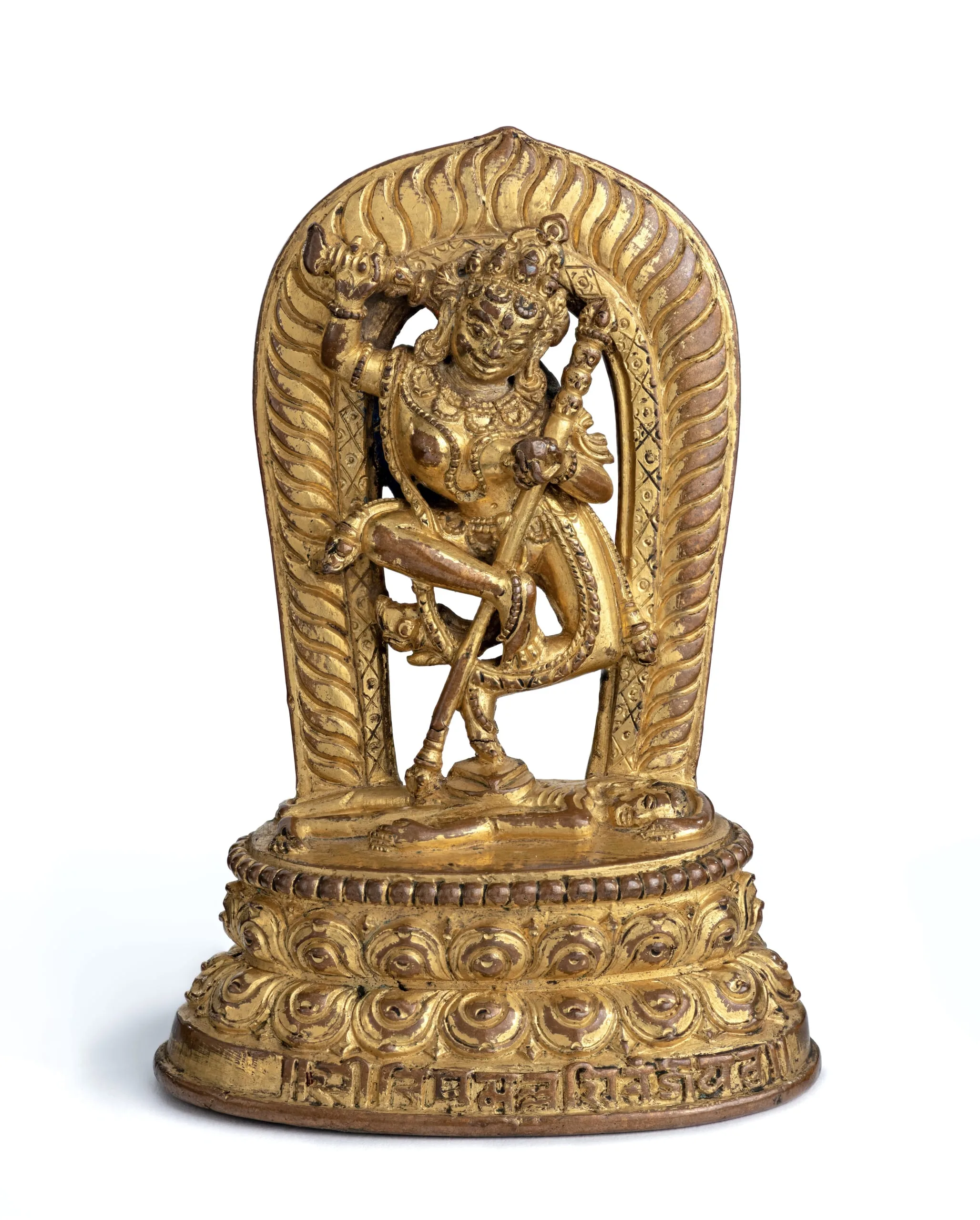 Nairatmya is portrayed in the "half cross-legged" dance posture (ardhaparyanka-nritya), symbolic of a joyous and passionate Buddha nature. She is trampling a corpse atop a double lotus base with a cast devanagari inscription. She has a third eye, an ascetic’s piled hair crowned by a thunderbolt (vajra), a tiara, and profuse jewelry, including a long garland of severed skulls. Serpents are wrapped around her waist. Her upraised right hand holds a flaying knife (kartika) and her left hand holds a skullcup. A ritual staff (khatvanga) rests on her left shoulder. She is backed by a flaming aureole (prabhavali) with a diamond border.