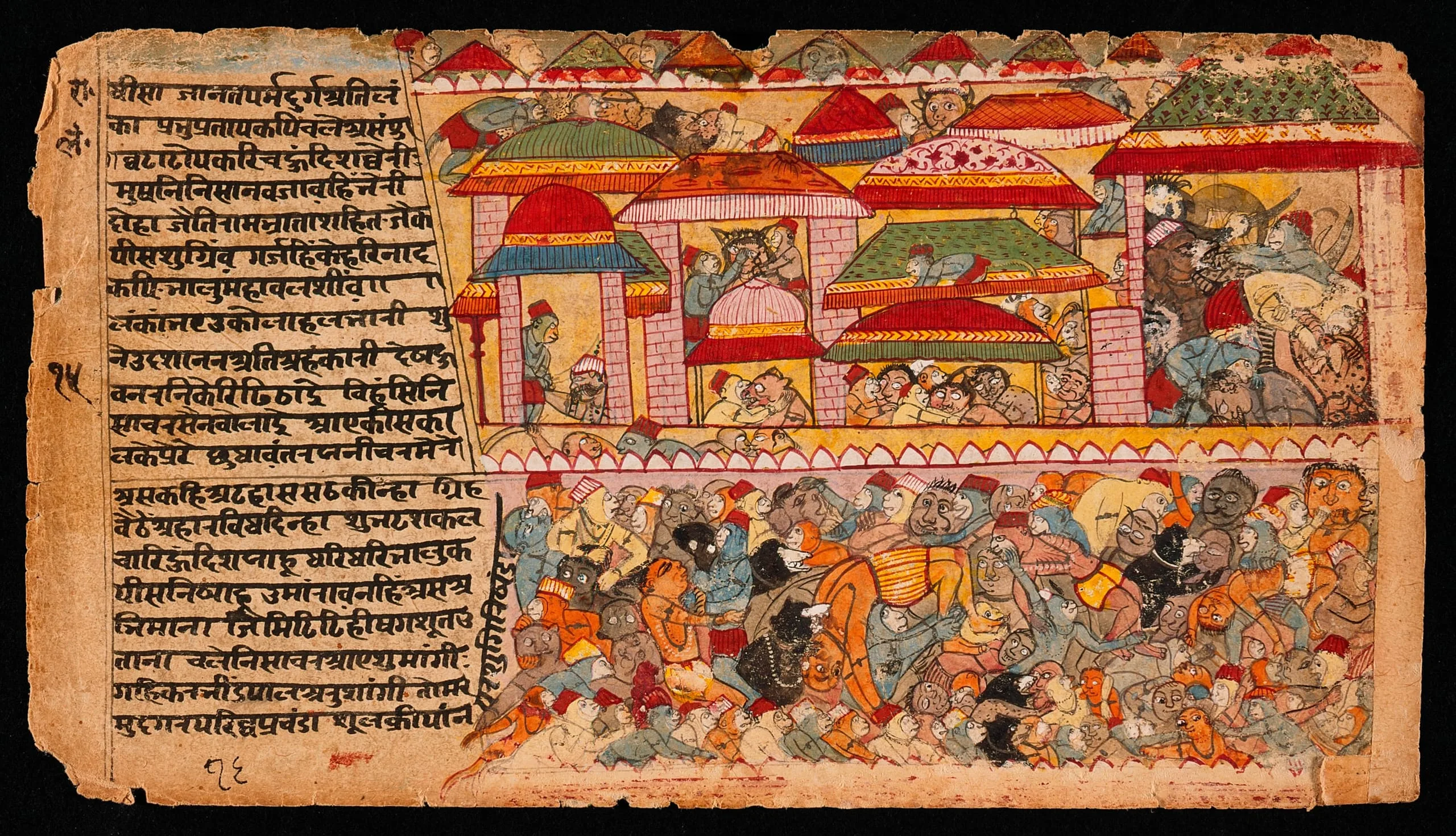 This folio (no. 15) is from a series of a vernacular Hindi recension of the Ramayana, the Ramacharitmanas (Holy Lake of the Deeds of Rama), composed in 1575 by Tulsidas (1511-1623), who was born in Soron, Uttar Pradesh, and studied Sanskrit grammar in Varanasi. The Ramacharitmanas differs primarily from the Ramayana in that it portrays Rama as divine rather than mortal and it gives considerably increased emphasis to the role and personality of Hanuman.