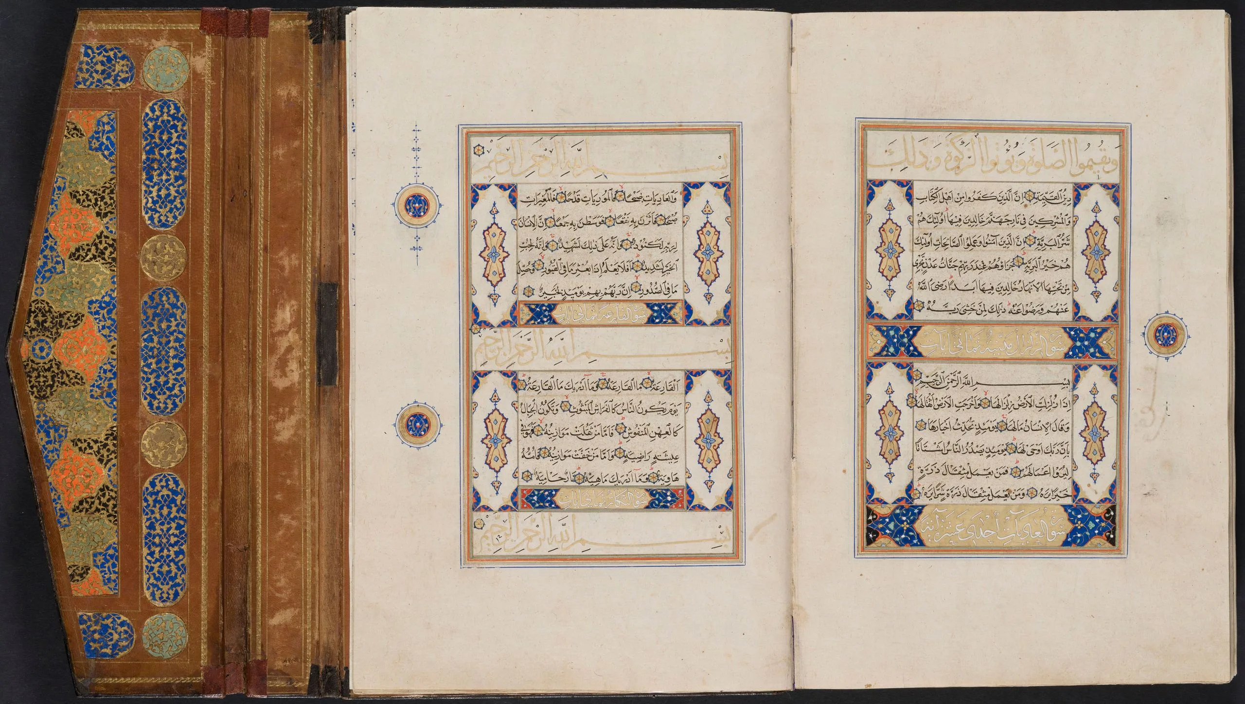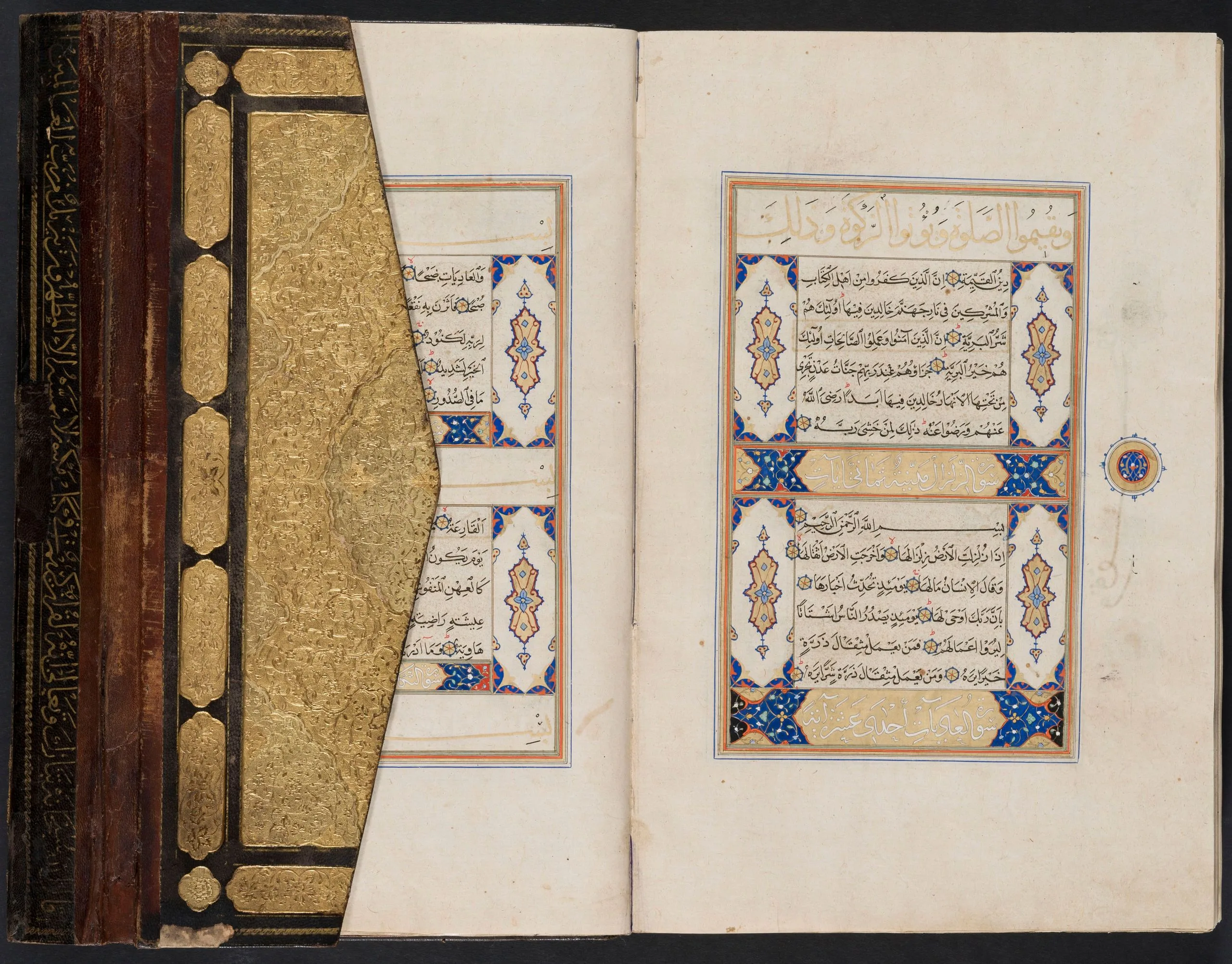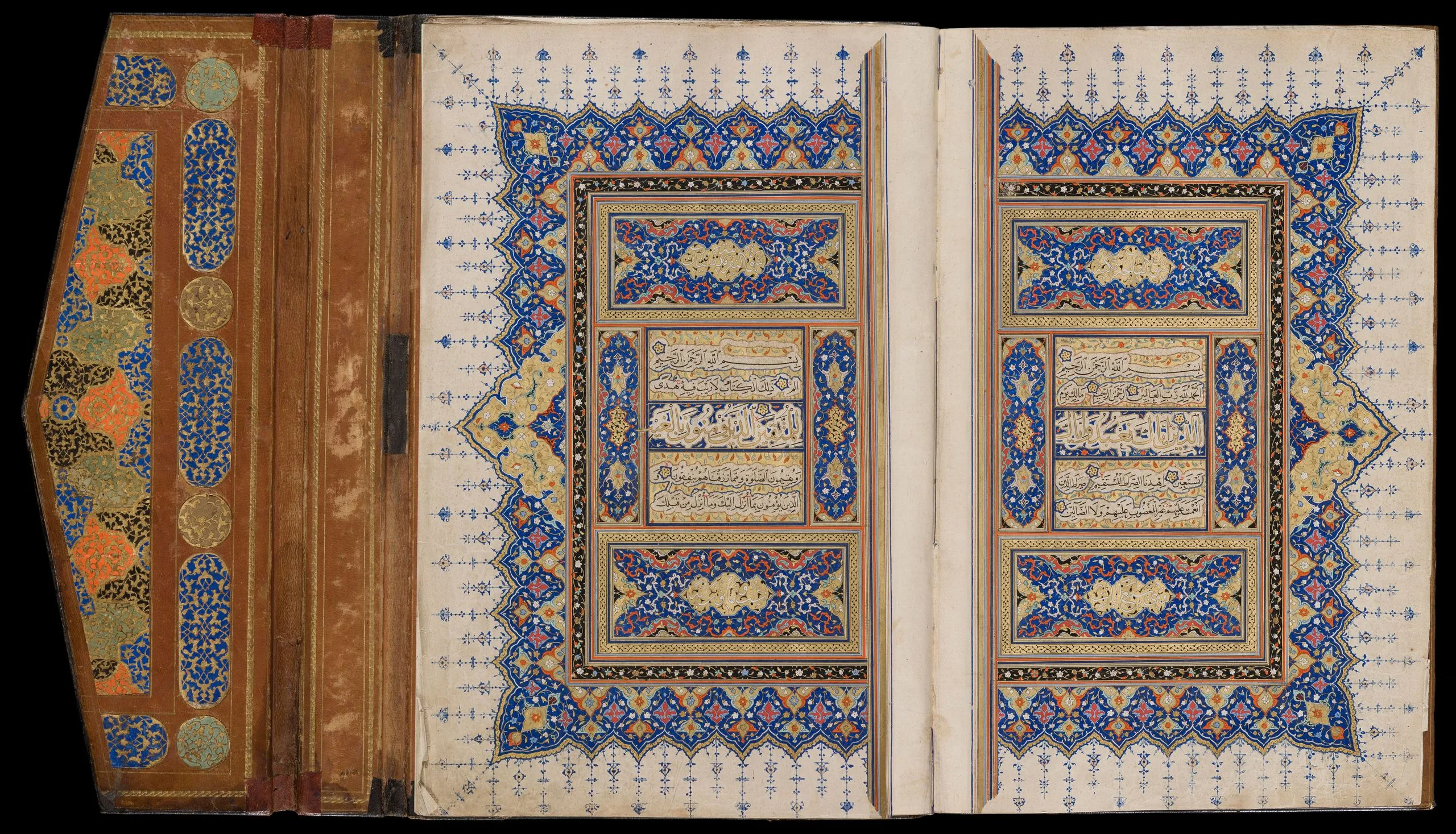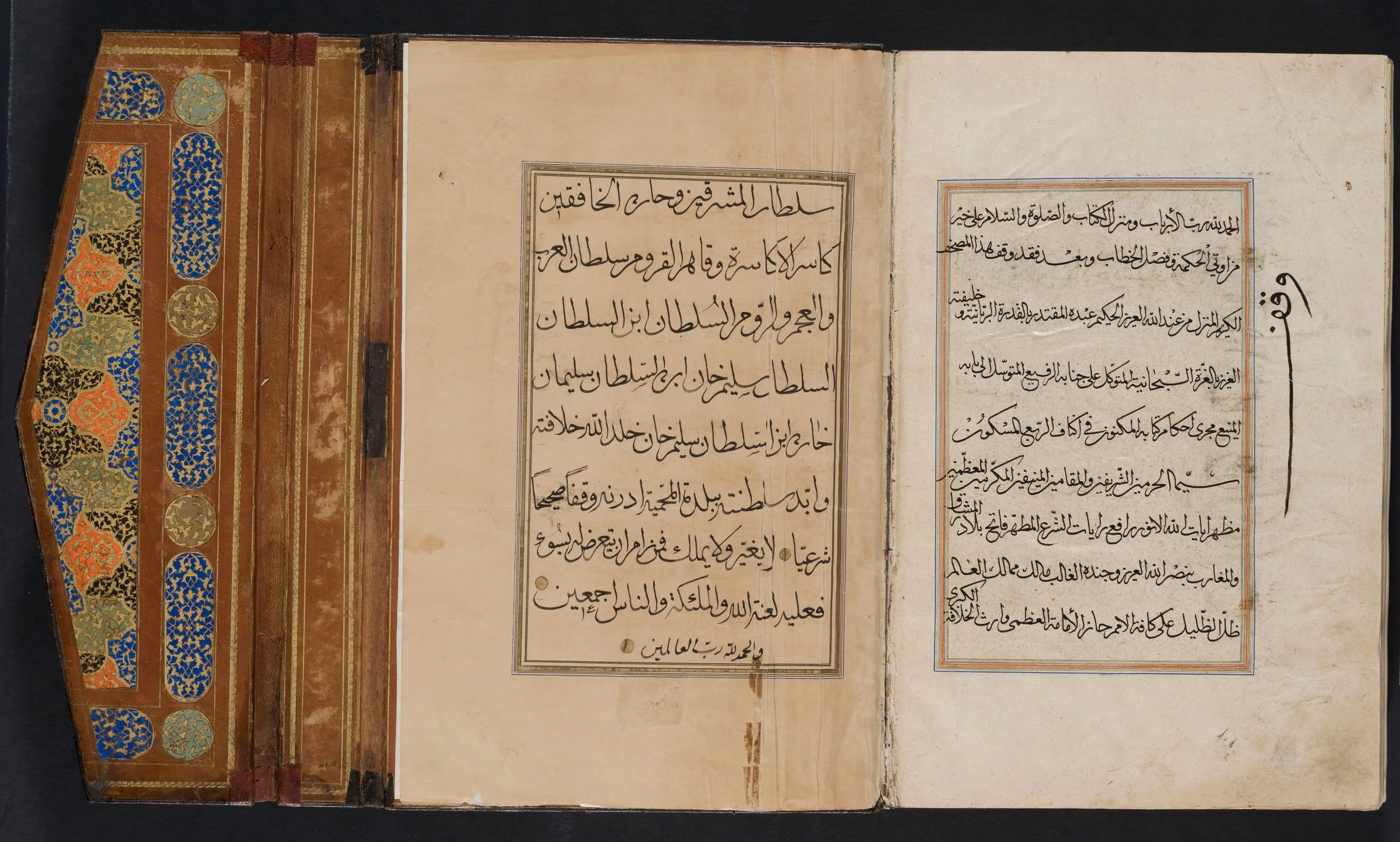 Shiraz was a significant and highly prolific center for the production of luxury manuscripts, including copies of the Qur’an, some of which were intended for export. In fact, there is evidence to suggest that this famed southern Iranian city was a major supplier of deluxe books for Turkey. Manuscripts of the Qur’an produced in Shiraz, including richly illuminated examples, must also have arrived at the Ottoman court as diplomatic gifts. Such was likely the case with this manuscript. According to a notation at the end of the text, part of which is a replacement for the original, perhaps contemporaneous with the eighteenth-century Ottoman binding, Sultan Selim II (r. 1566–74) endowed the manuscript in Edirne, presumably for the magnificent mosque complex he built there in 1568–74.