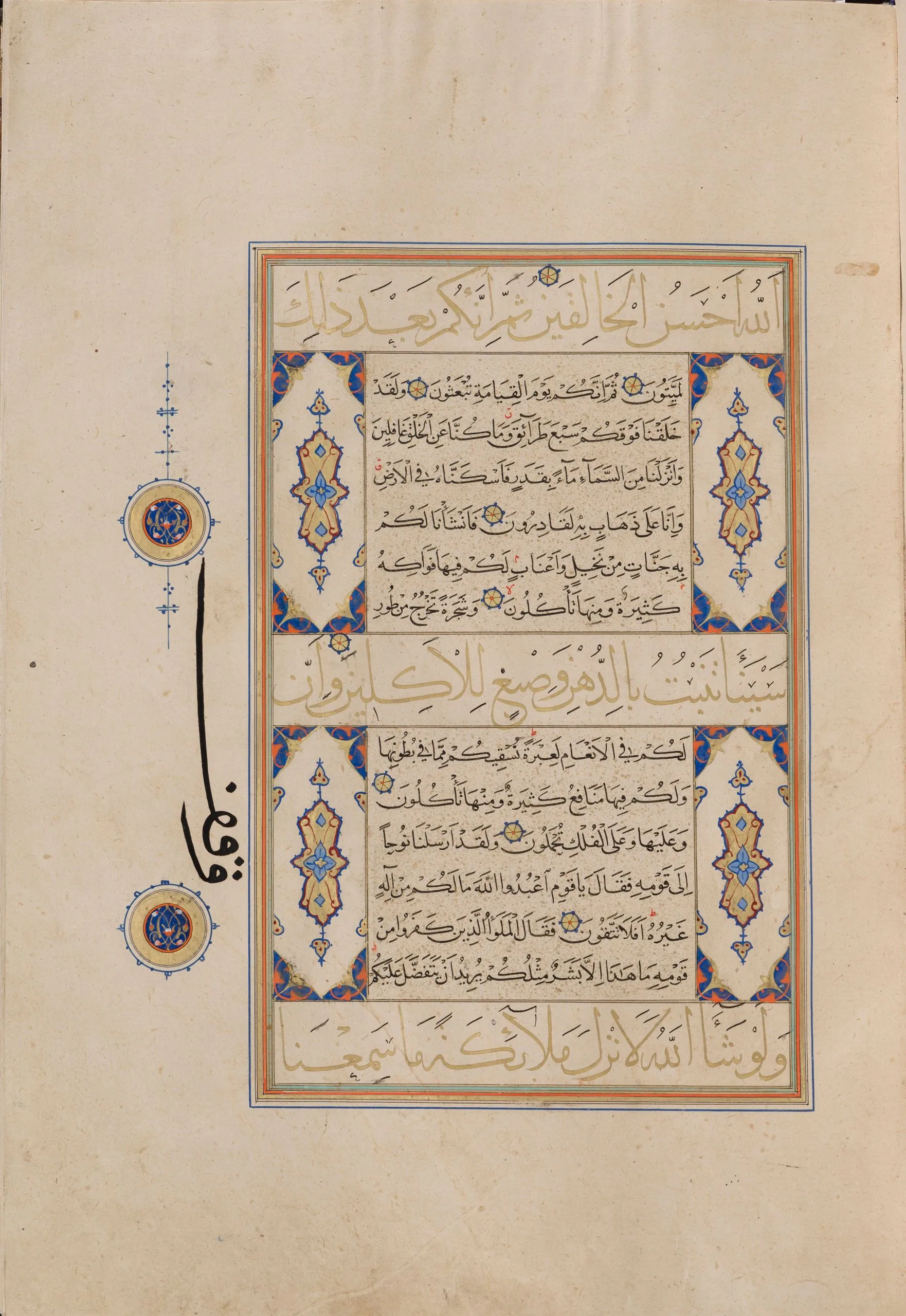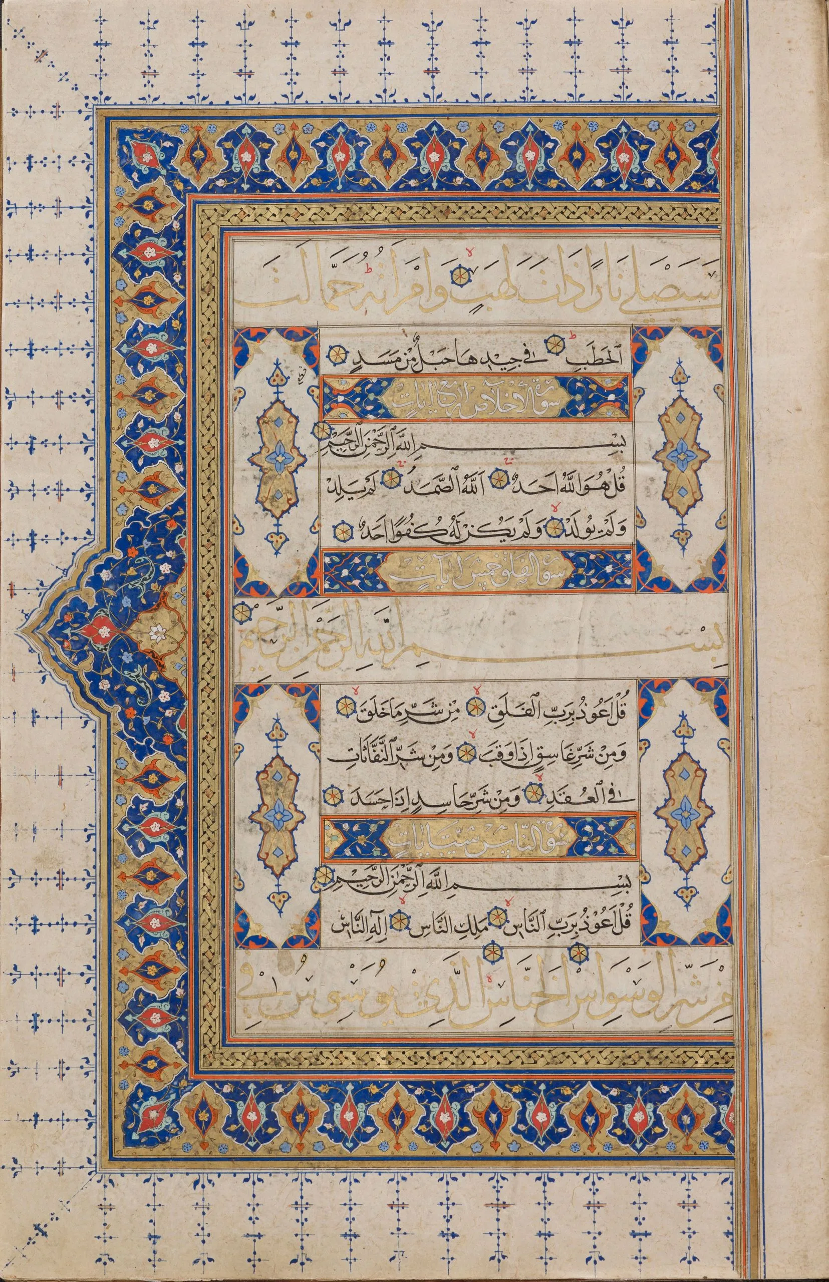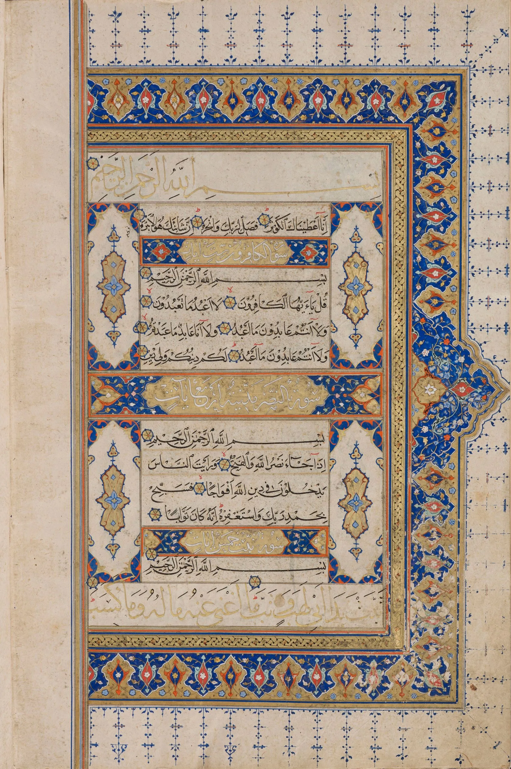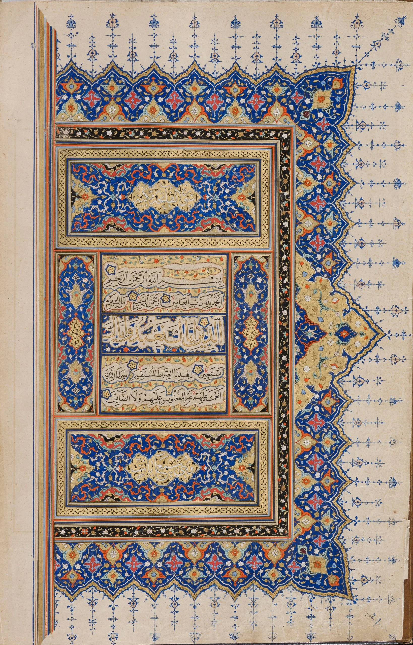 Shiraz was a significant and highly prolific center for the production of luxury manuscripts, including copies of the Qur’an, some of which were intended for export. In fact, there is evidence to suggest that this famed southern Iranian city was a major supplier of deluxe books for Turkey. Manuscripts of the Qur’an produced in Shiraz, including richly illuminated examples, must also have arrived at the Ottoman court as diplomatic gifts. Such was likely the case with this manuscript. According to a notation at the end of the text, part of which is a replacement for the original, perhaps contemporaneous with the eighteenth-century Ottoman binding, Sultan Selim II (r. 1566–74) endowed the manuscript in Edirne, presumably for the magnificent mosque complex he built there in 1568–74.