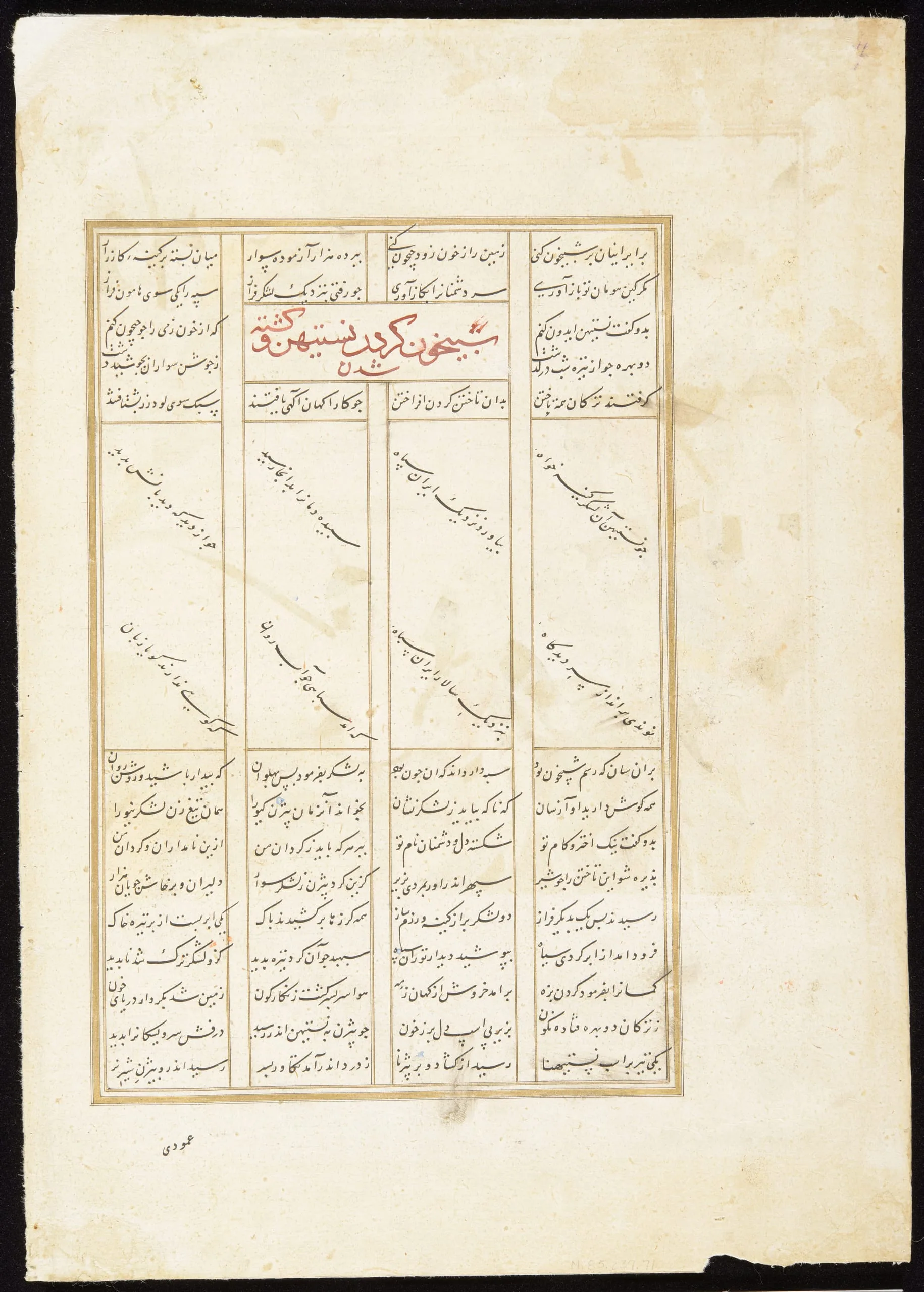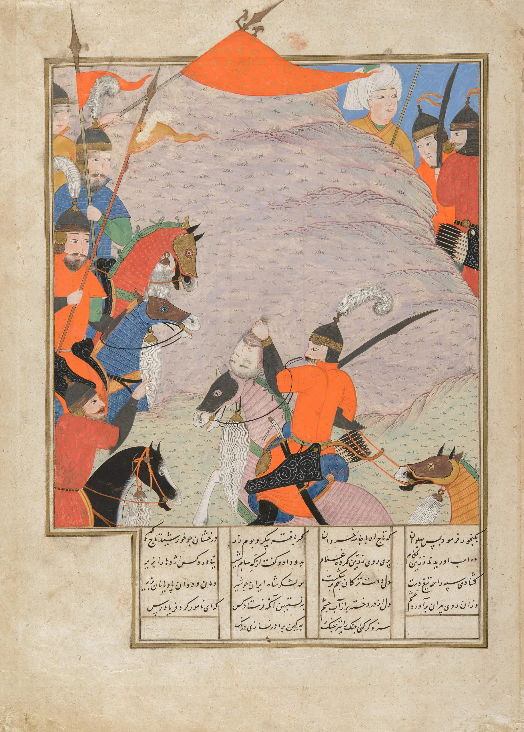 Battle is a major theme of the Shahnama (Book of Kings), the Iranian national epic, which tells of the pre-Islamic kings, whose reigns are often punctuated by warfare, and the heroes who fight on their behalf. As this painting from a late fifteenth-century Shahnama manuscript demonstrates (also see M.75.24), illustrators rarely shied away from depicting the battlefield violence described throughout the poem. Here, the Iranian hero Bizhan triumphantly brandishes the head of his foe, a warrior named Human from the rival kingdom of Turan (Central Asia). Notably, the figures sport armor and weapons not of the epic’s ancient setting but of the period in which they were painted.