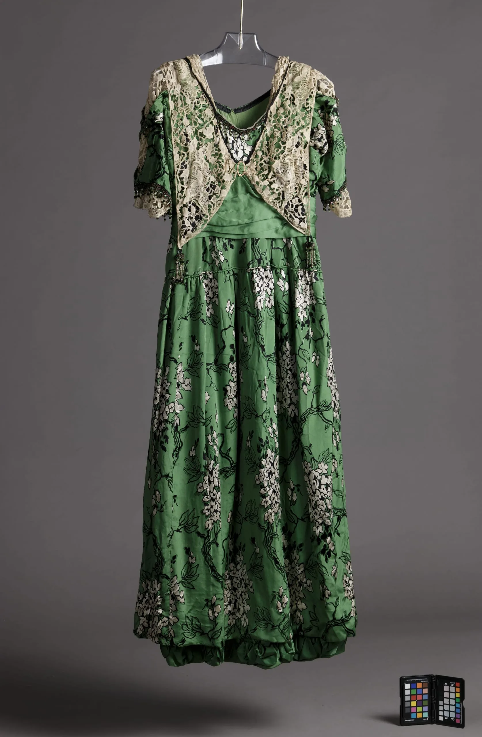 - Silk plain weave (crepe) with warp patterning, printed with silk satin, cotton lace, glass beads, and metal buckle
