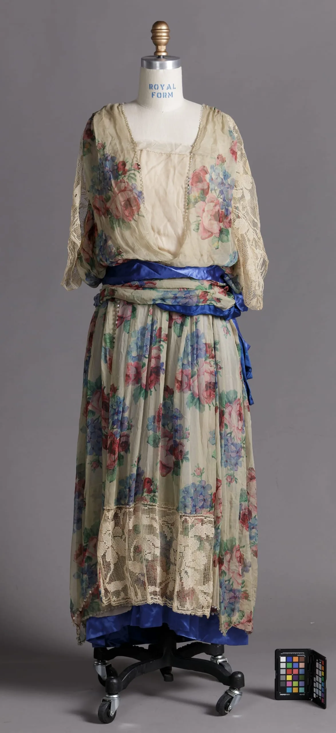 - Silk plain weave (crepe chiffon), printed, with linen lace, silk net, silk satin, and glass beads