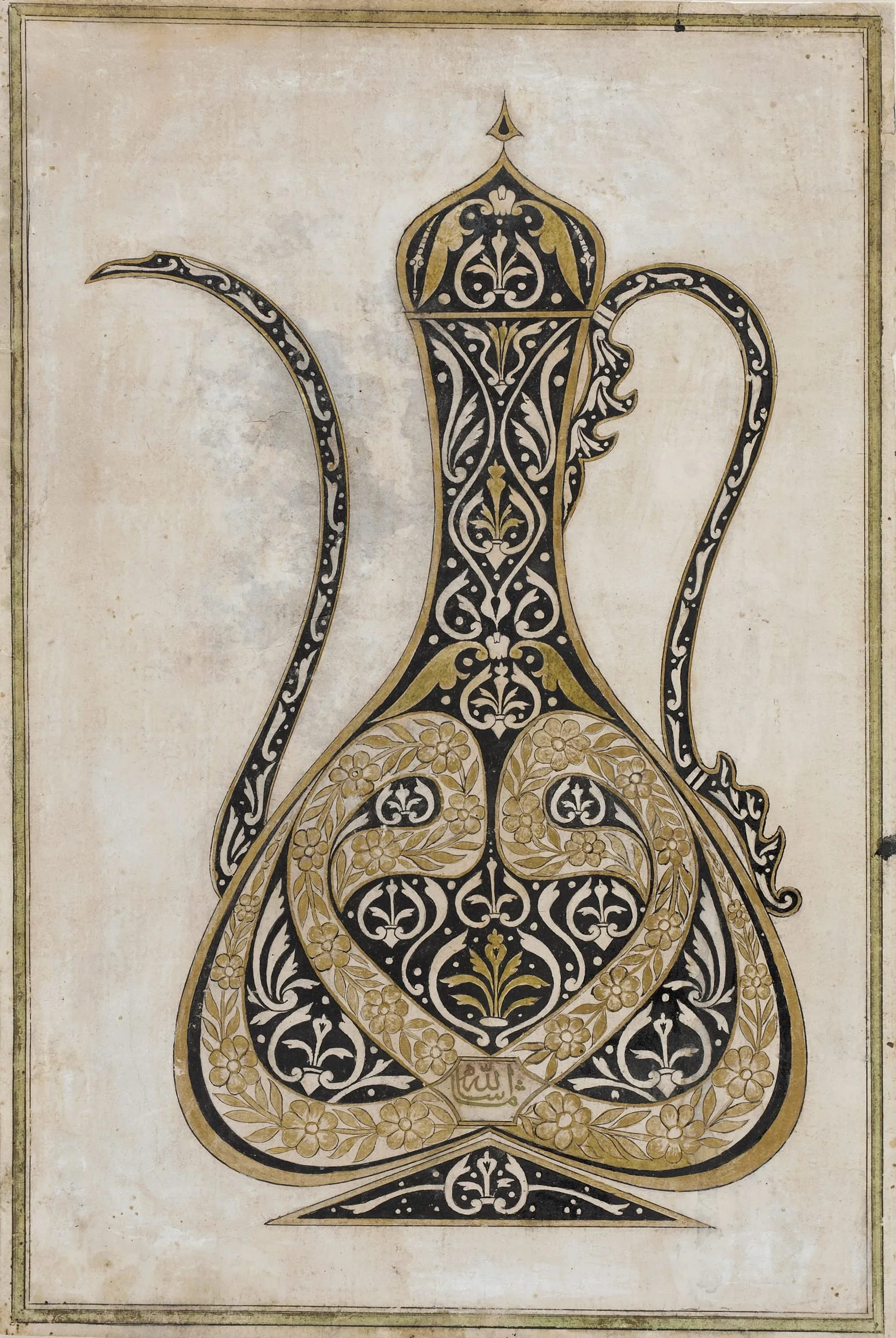 Arabic script is remarkably versatile, and Islamic calligraphers have always been able to draw on its many decorative possibilities, as here where the letter waw (and) is written in large scale normally and in mirror image to form the body of a ewer. Rendered in a tiny script at the juncture of the two waws is the phrase ma sha’allah, "Whatever God wills." Despite this recognizable calligraphy, the strong outline of the ewer and its floral decoration predominates.