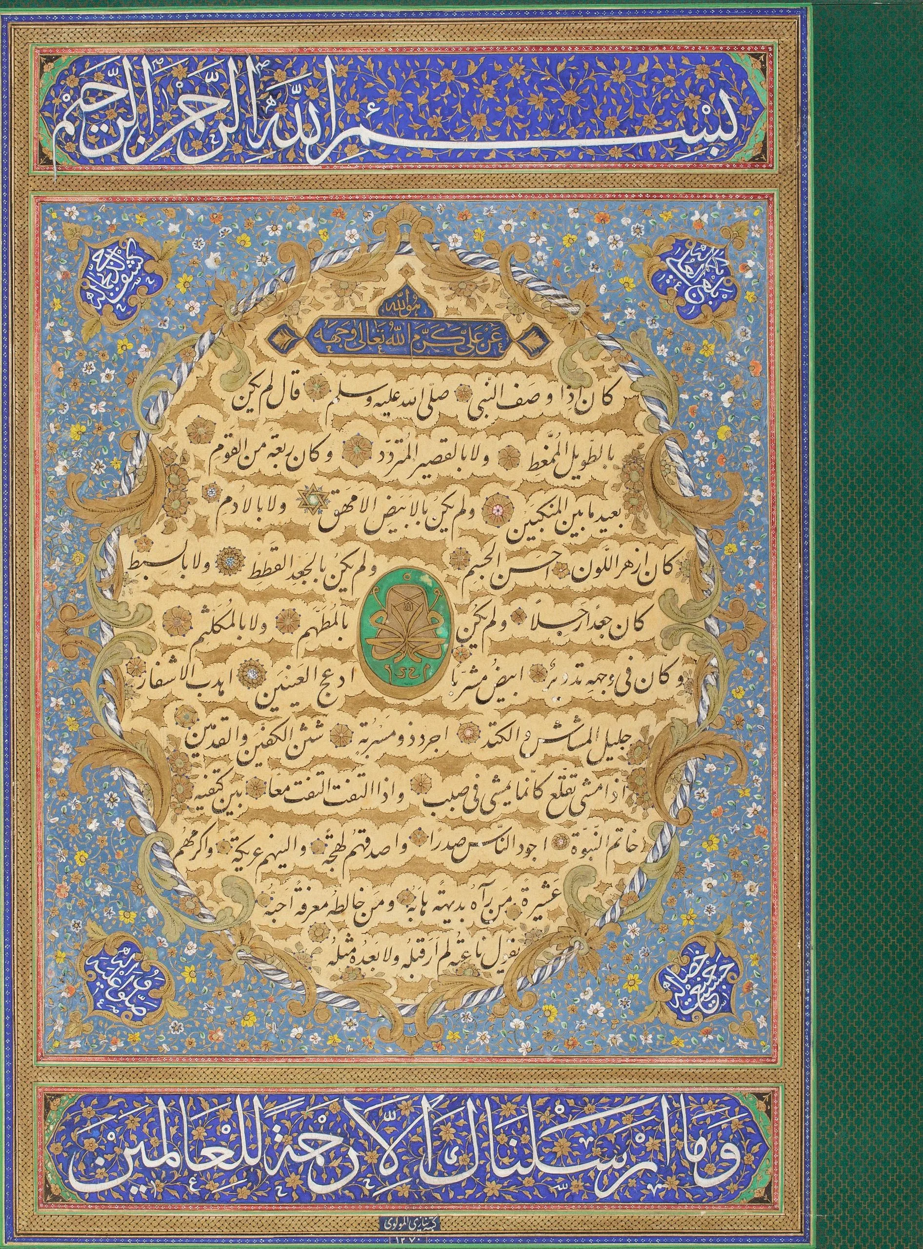 The illumination of this elegant page further enhances the beauty of the superb calligraphy. The text, in thuluth and ta‘liq scripts, is a hilye, or a verbal portrait of the Prophet Muhammad, describing both his general physical attributes and charismatic nature. As visual representations of the Prophet's visage were often discouraged in Islam, word portraits came to be used, especially in Ottoman Turkey, where they developed into an art form.
