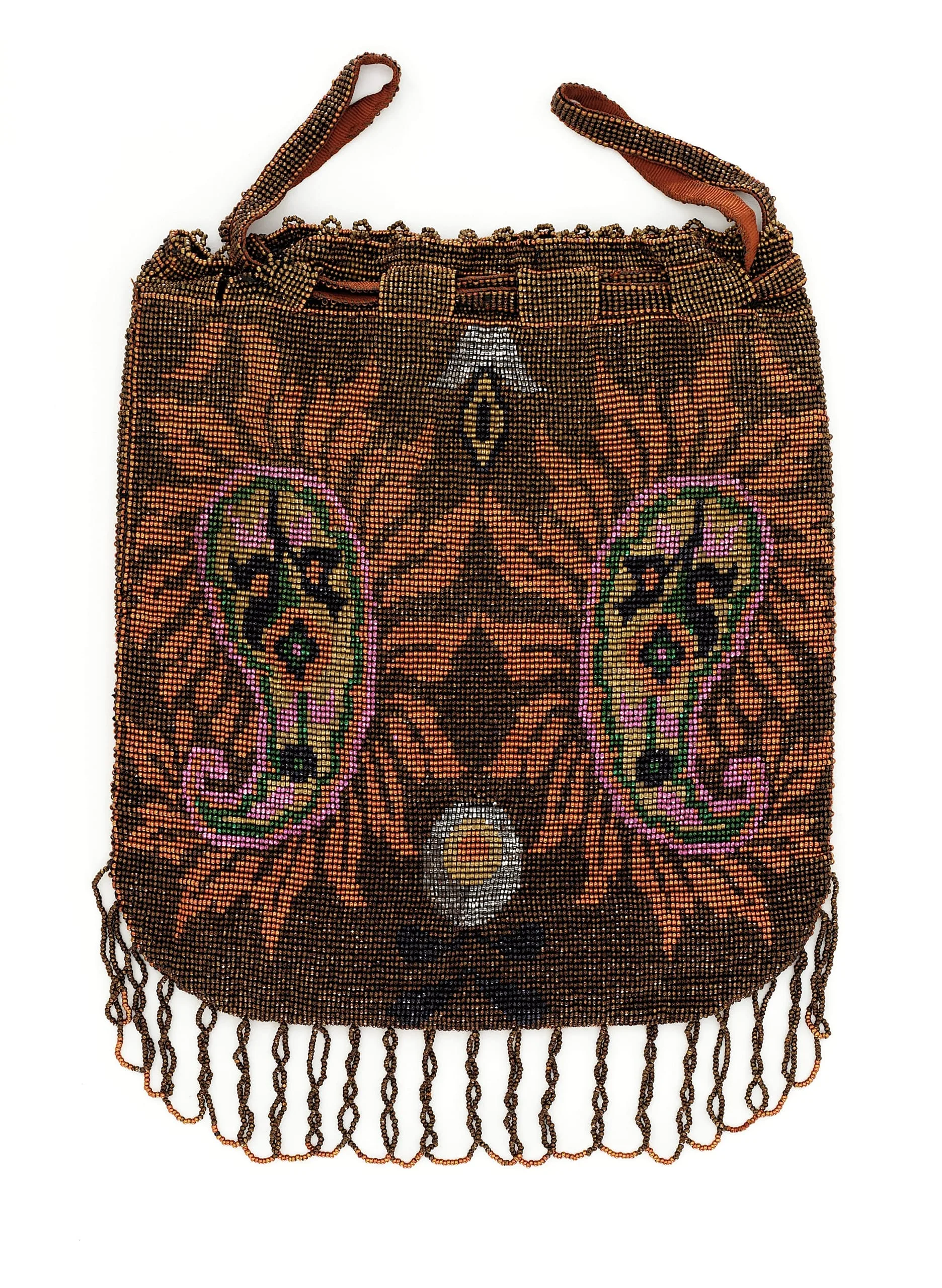 Beaded drawstring bag with copper-brown ground, symmetrical peacock or floral motifs in green, black, and lavender beads, and a looped bead fringe along the bottom edge