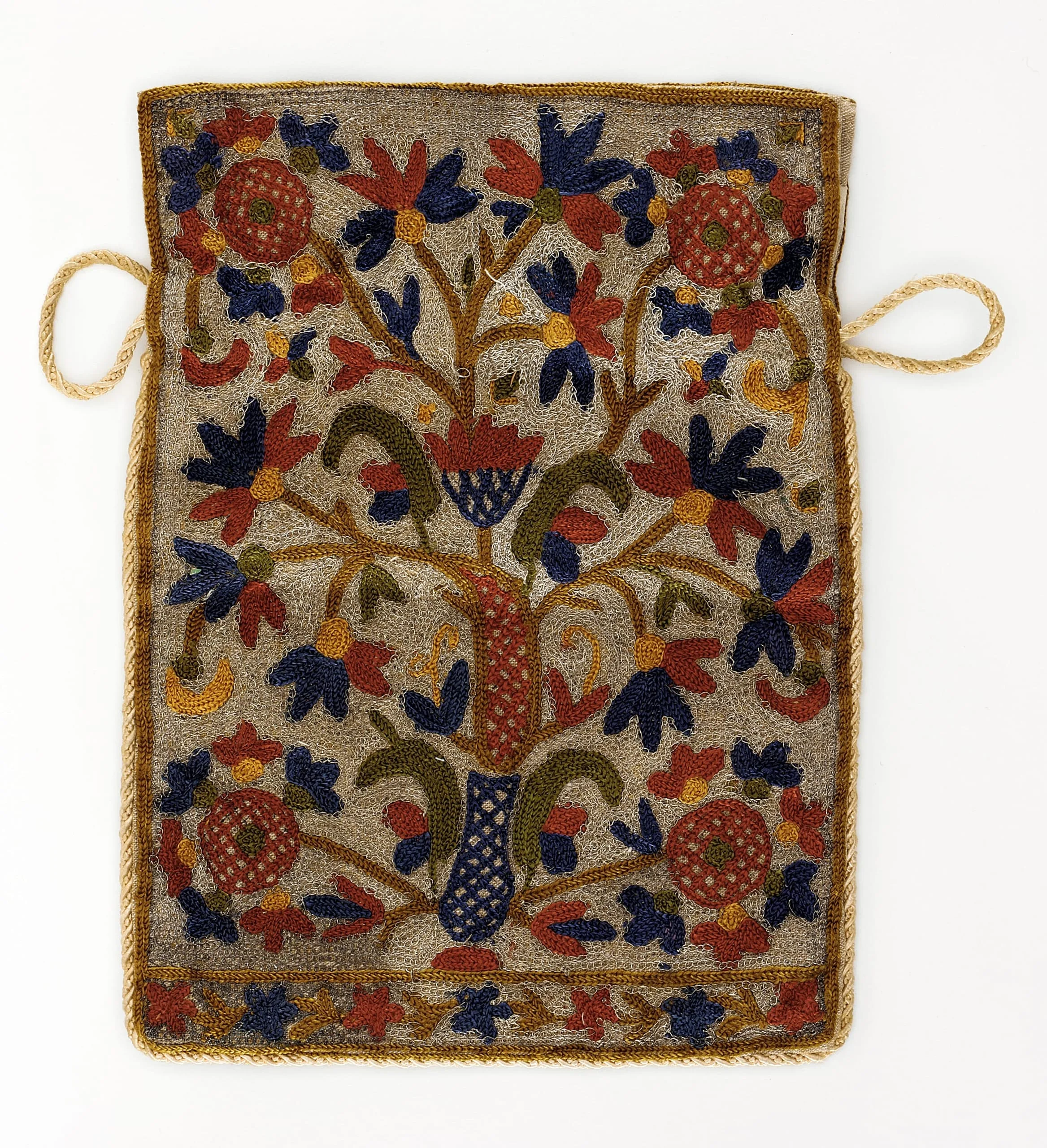 Embroidered drawstring pouch with silver metallic ground, decorated with a central tree-of-life design in navy, brick red, olive green, and gold thread