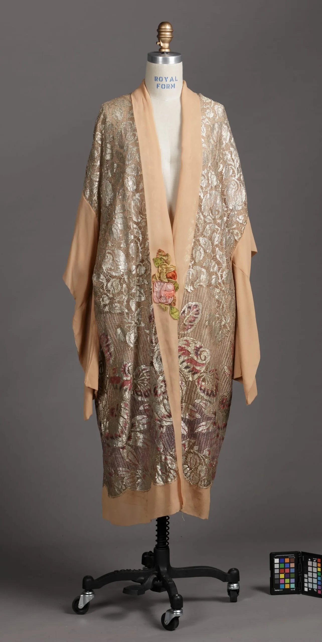 - Silk plain weave (chiffon), with silk and metallic thread machine-made lace, painted, silk and metallic thread appliqué decoration