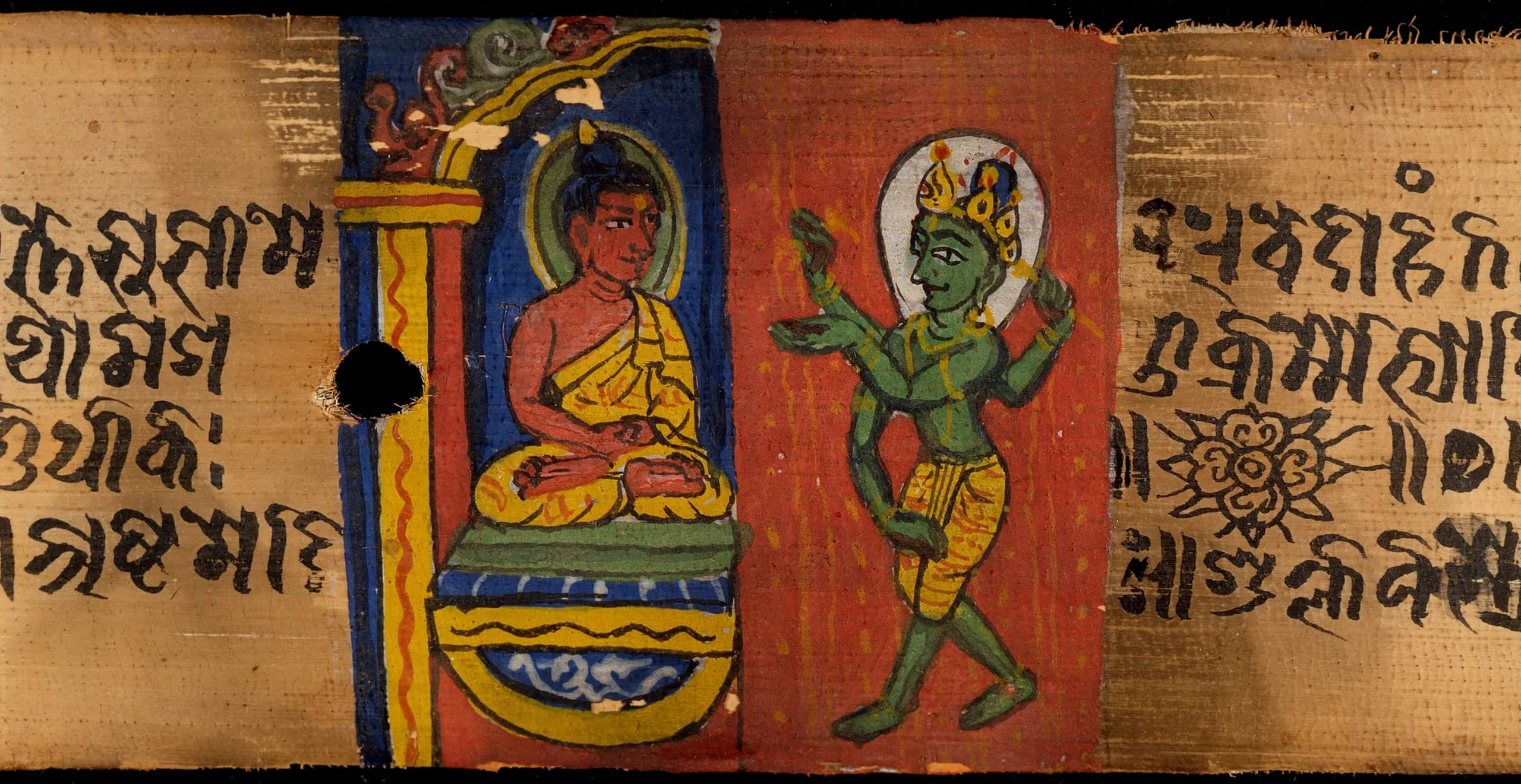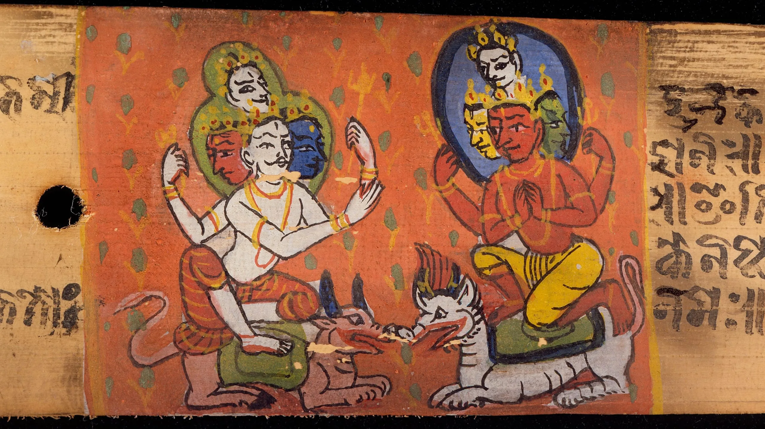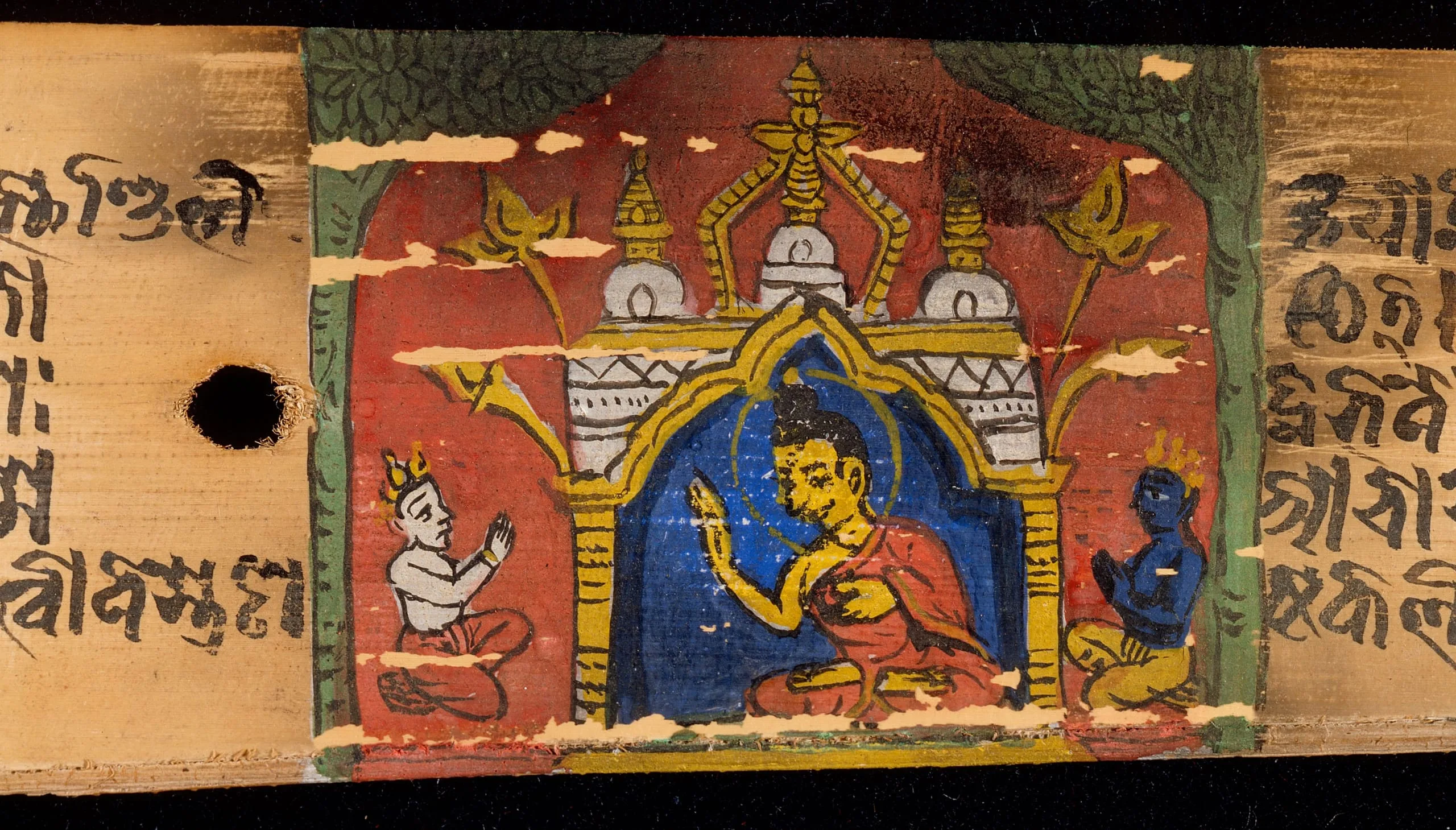 - Opaque watercolor and ink on palm leaf with varnished wood covers