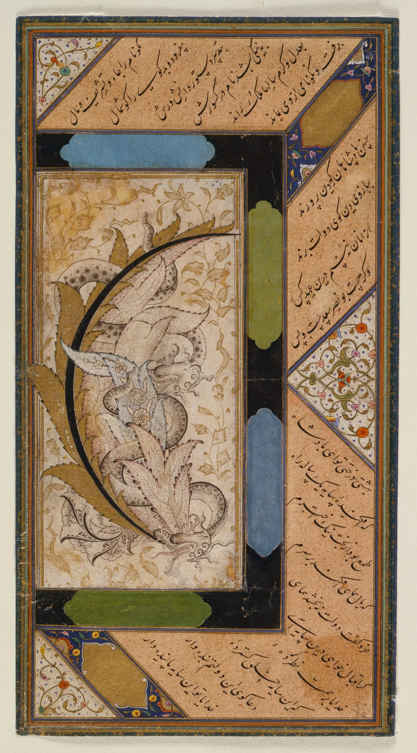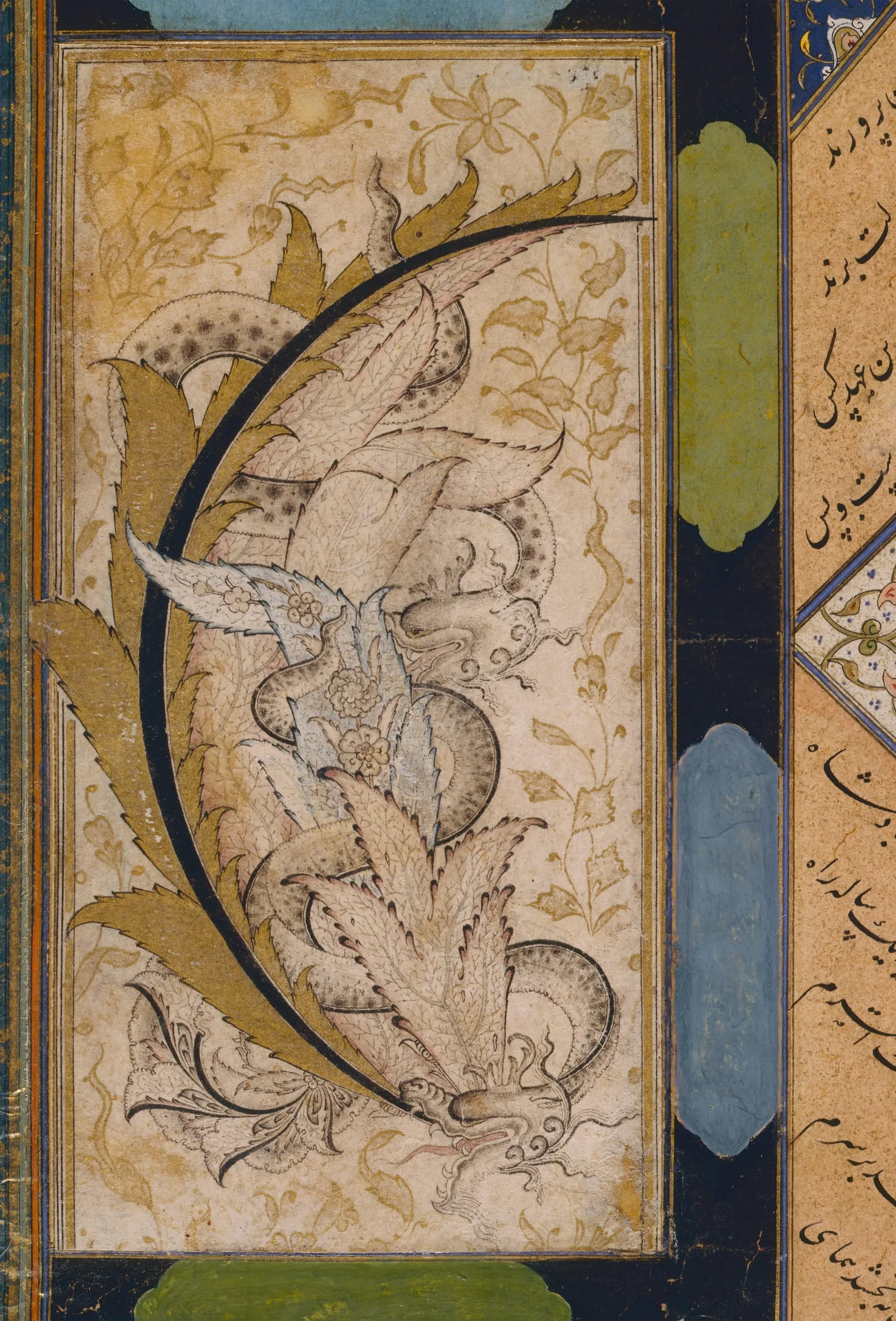 - Ink, color washes, and gold on paper