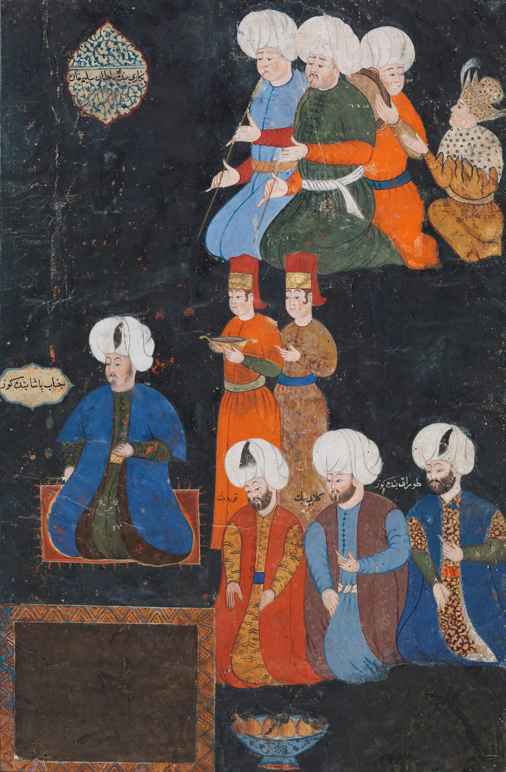 From the late sixteenth century until the formation of the Republic of Turkey in 1922, the Ottoman sultans maintained a strong tradition of imperial portraiture. Influenced by European oil painting and Persian miniatures, Ottoman portraits provide important information about court ceremonies, changing fashions, and members of the court. The right side of a double-page composition, this painting was created as a pendant to a portrait of Selim II on the left, now in the collection of the Aga Khan Museum, Toronto. The musicians, servants, and courtiers, who are identified by their inscriptions, face left, toward the sultan, in a show of deference to their ruler.