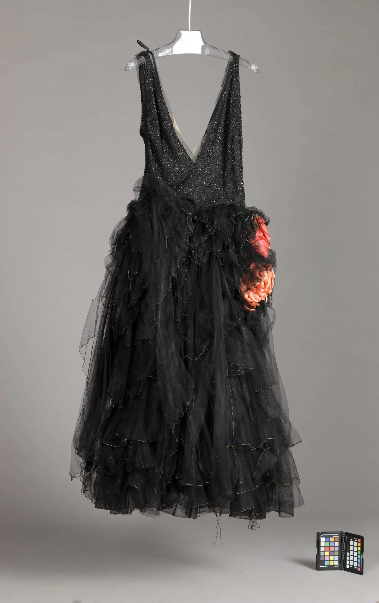 - Silk tulle, with metallic thread embroidery, silk plain weave (crepe), glass beads, and silk plain weave and silk velvet flowers