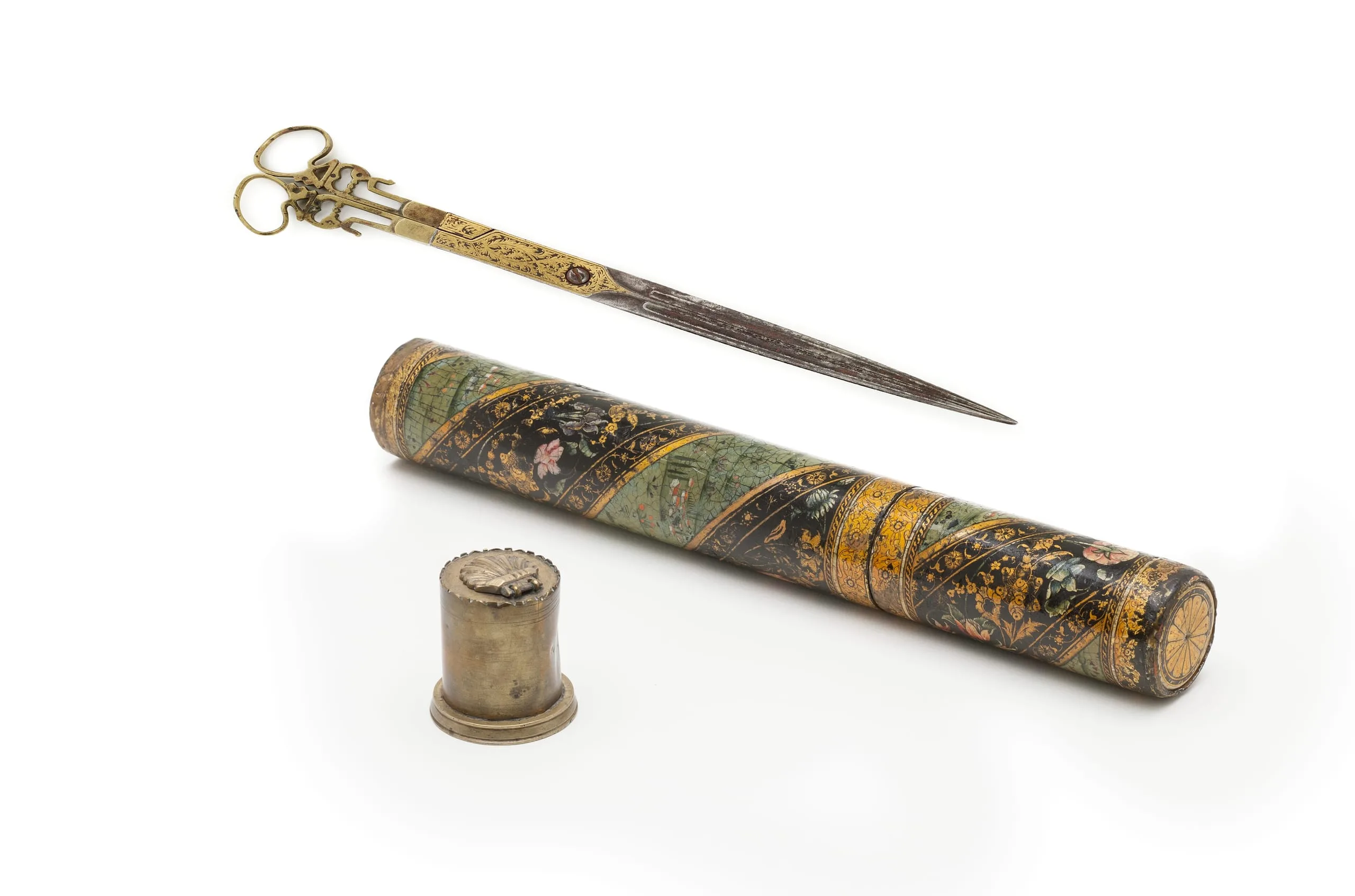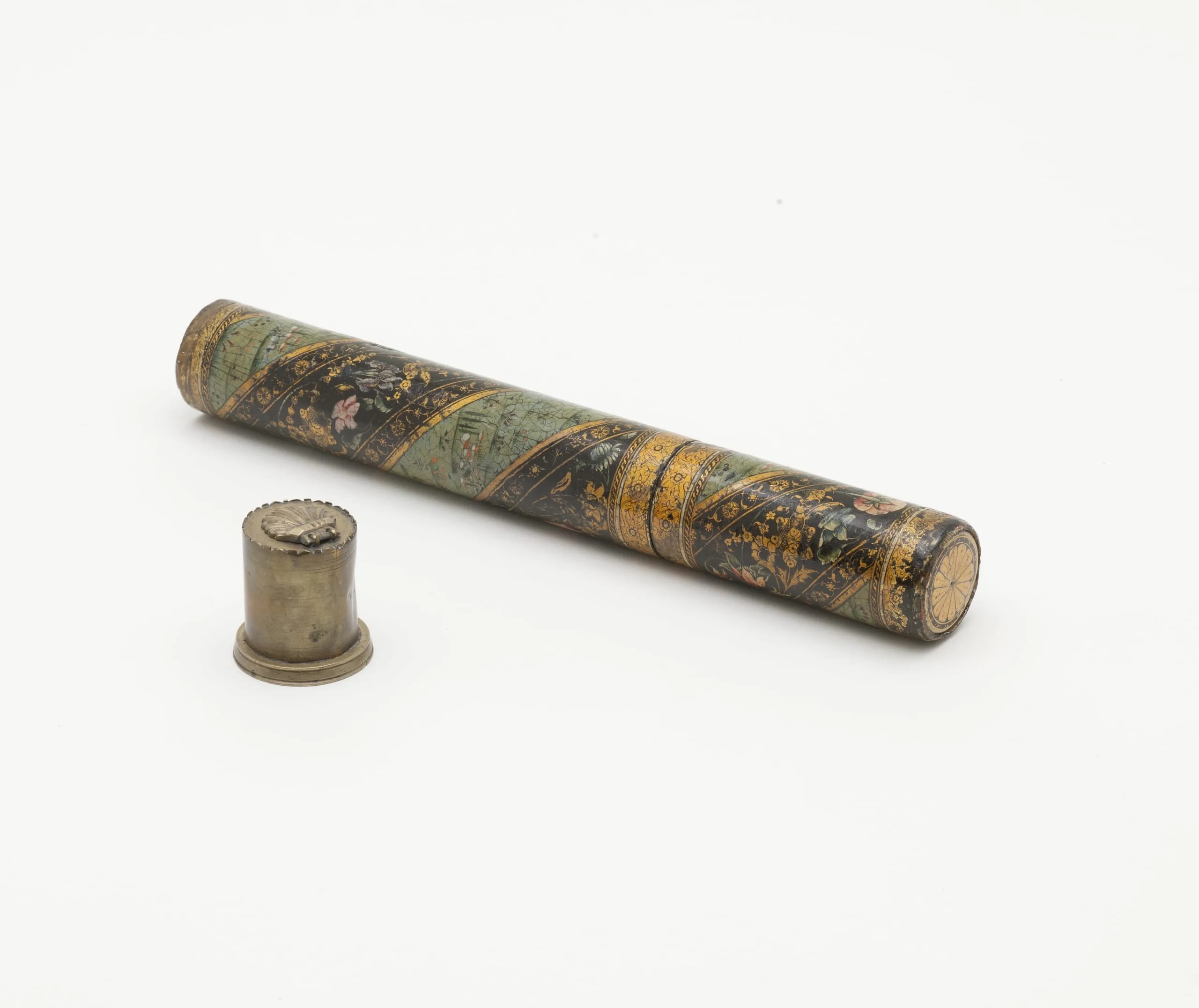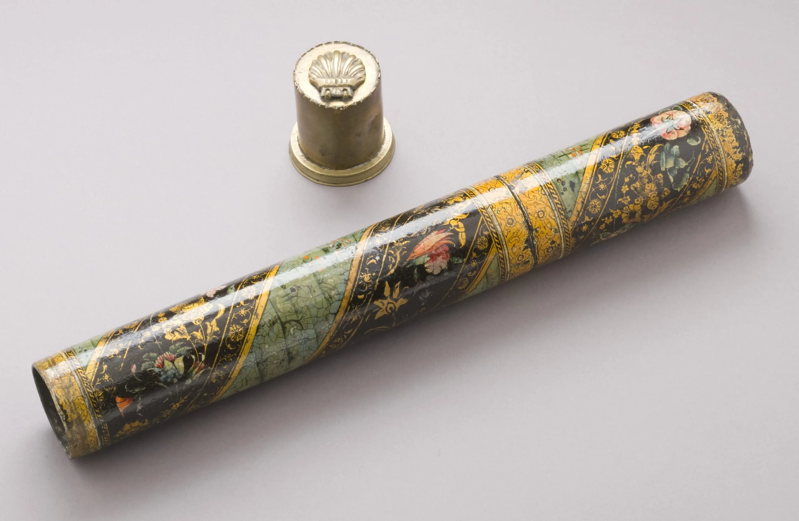 Even with the advent of mechanical printing in the eighteenth century, calligraphy remained an important art form in the Islamic world, particularly in Ottoman Turkey, as can be seen in the continued embellishment of calligrapher’s tools. Cylindrical cases like this lacquer one were a popular form that allowed calligraphers to transport documents and tools, such as the small brass inkwell that cleverly slides into the bottom of the case.