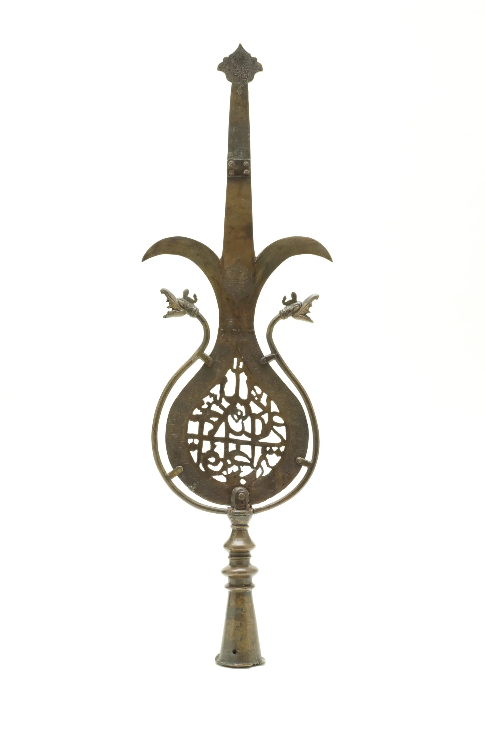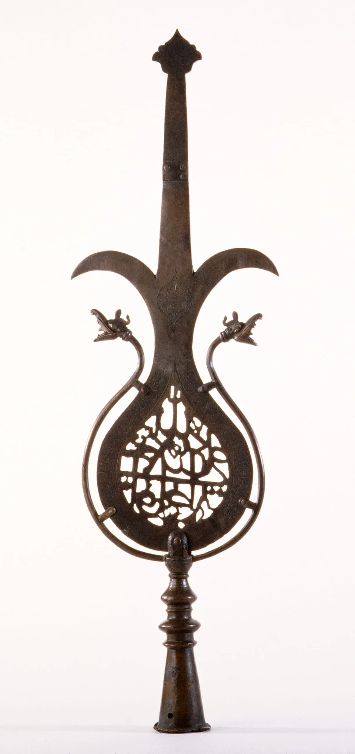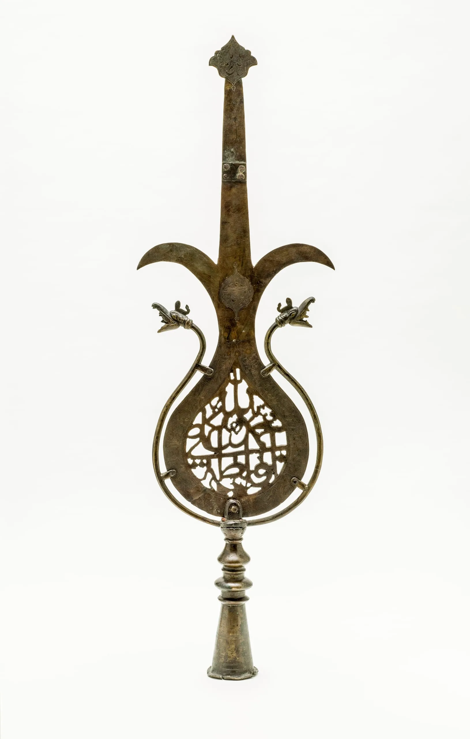 Unlike Sunni Muslims, Shi‘ites believe that the Prophet Muhammad designated ‘Ali, his cousin and son-in-law, as the next leader (imam) of the Islamic community. This office was inherited by ‘Ali’s sons (the Prophet’s grandsons by his daughter Fatima) and then passed to successive generations of male descendants. Inscribed throughout with invocations to God, the Prophet, Fatima, and the imams, this standard was likely carried in Shi‘ite rituals such as Muharram processions or perhaps into battle as a proclamation of faith as well as a means of securing blessings and protection.