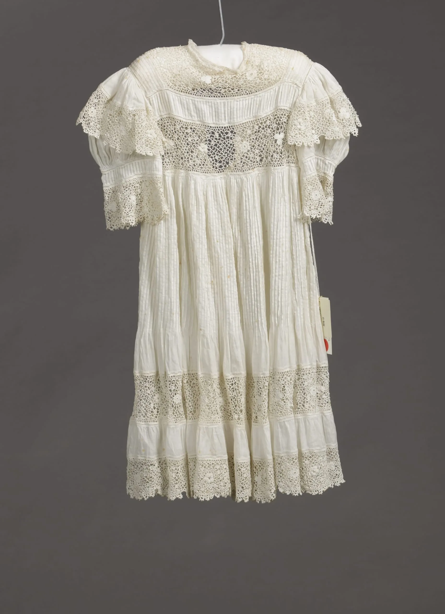 Child's ivory cotton dress with pin-tucked skirt, puffed sleeves, and multiple bands of open-work needle lace trim, displayed on a wire hanger