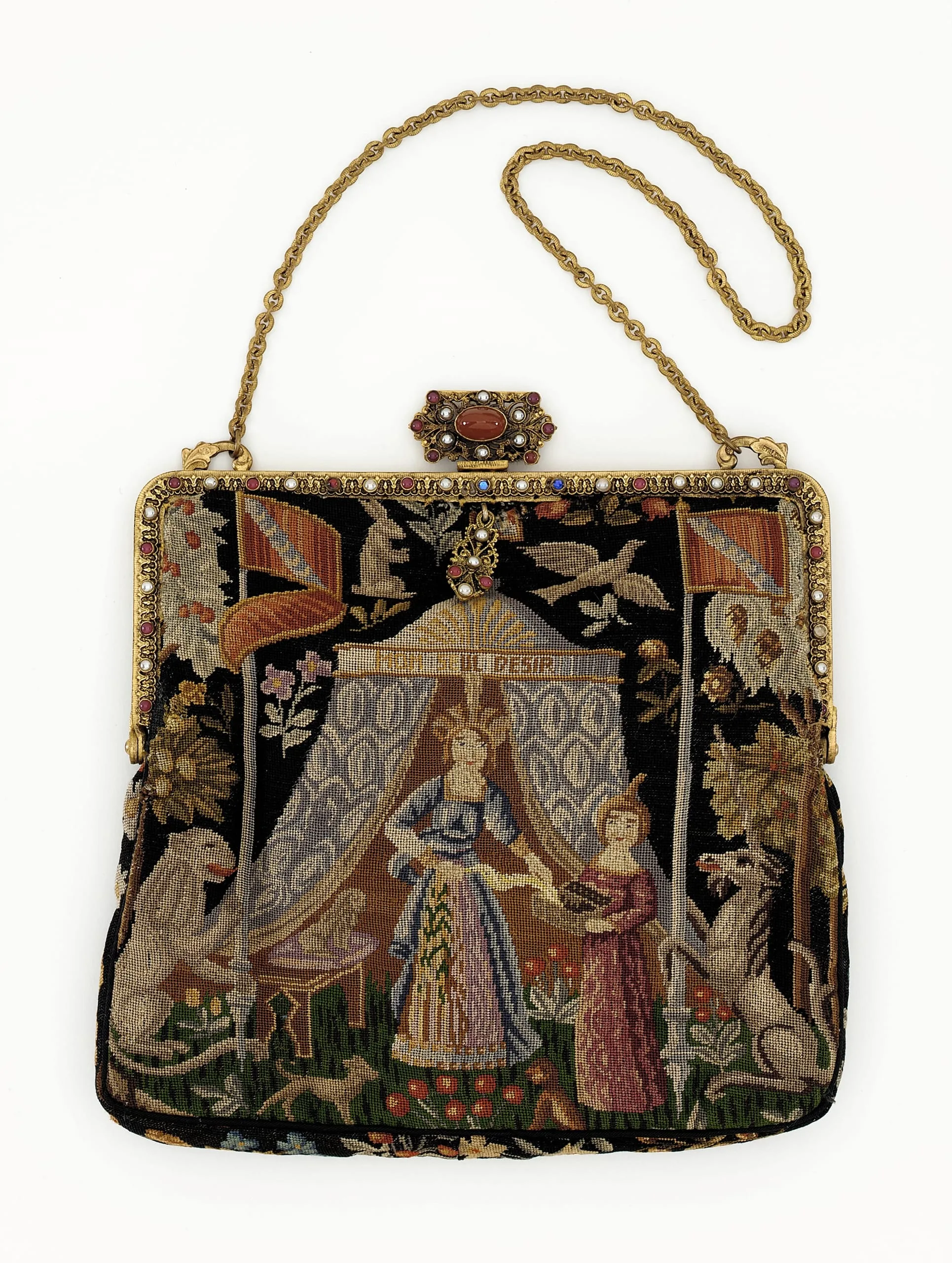 - Silk embroidery, paste stones, gilt metal, silk satin