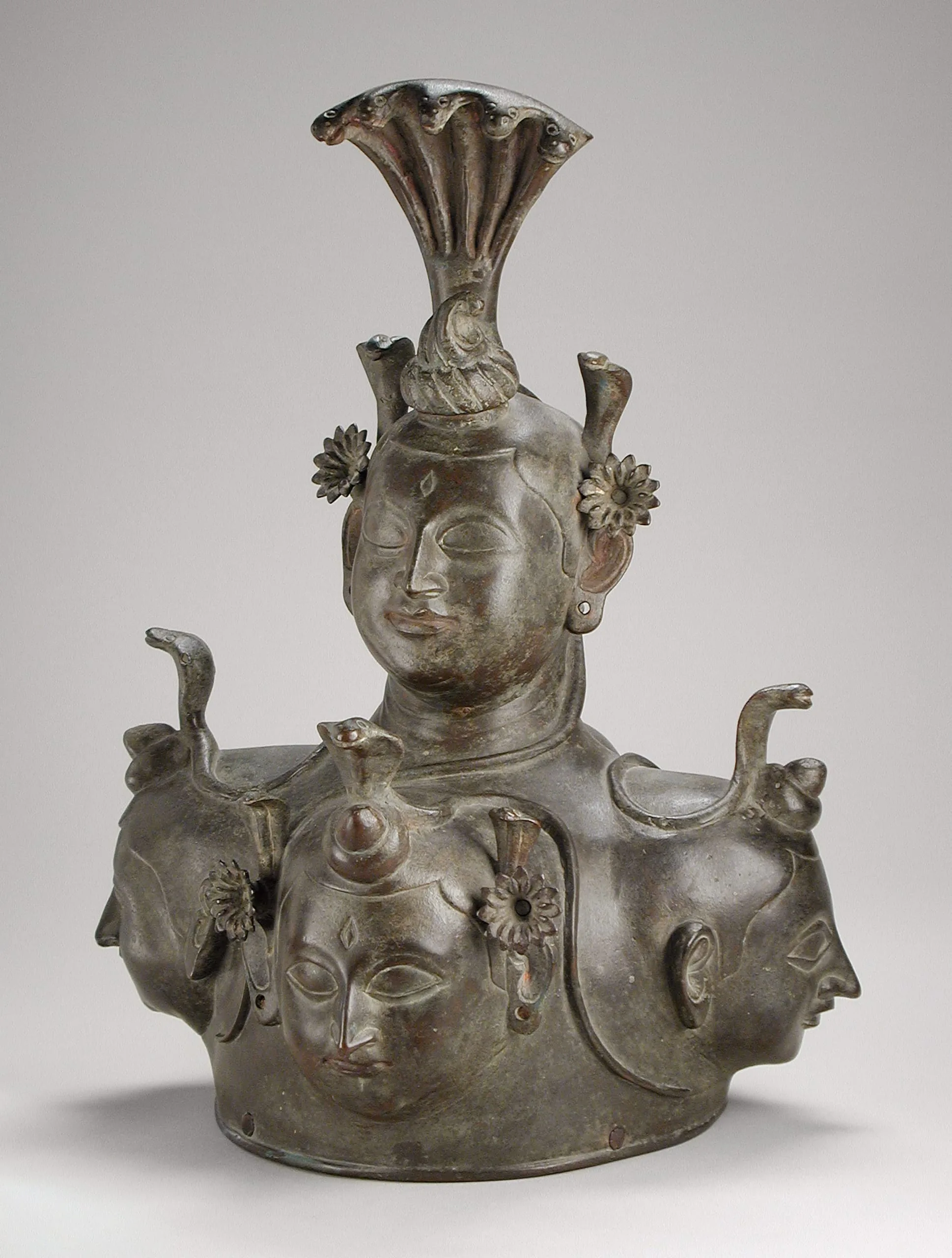 Since around the beginning of the Common Era, the Shivalinga (literally, the "sign" of Shiva) has been the quintessential symbol and artistic form used to represent the major Hindu god Shiva. In its core conception imagined as an aniconic column, the Shivalinga symbolizes the deity’s transcendental nature and primordial potency. As iconic imagery became increasingly prevalent in South Asian art, the Shivalinga was anthropomorphized by the addition of Shiva’s head emerging from the stone column in order to provide worshippers with a physical form that was considered more accessible than the abstract expression of his imperceptible reality. Multiple heads of Shiva were subsequently added to represent different philosophical aspects of the god. Alternatively, as is the case here, a metal cover with various faces of Shiva would have covered a plain stone shaft. To seek blessings from Shiva, devotees worship lingas with ritual offerings of flowers, food, and incense. The deity’s large eyes and welcoming gaze are thought to help worshippers establish a personal spiritual bond, thus strengthening the power of their offering.