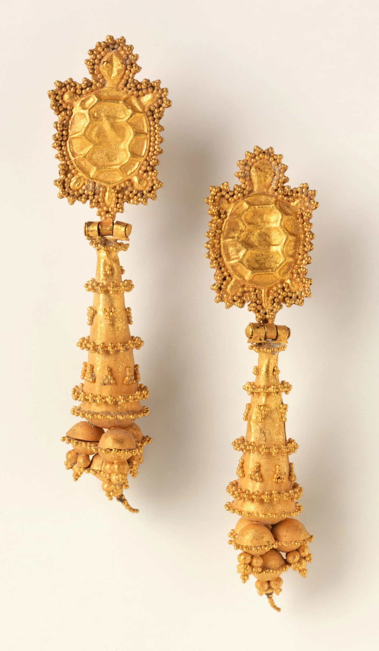 The upper element of each earring depicts a repoussé tortoise viewed from above. Beneath it is a hinged pendant is in the form of a tapering column embellished with bands and triangular clusters of granulations and terminated with hollow spheres and beads with granules.