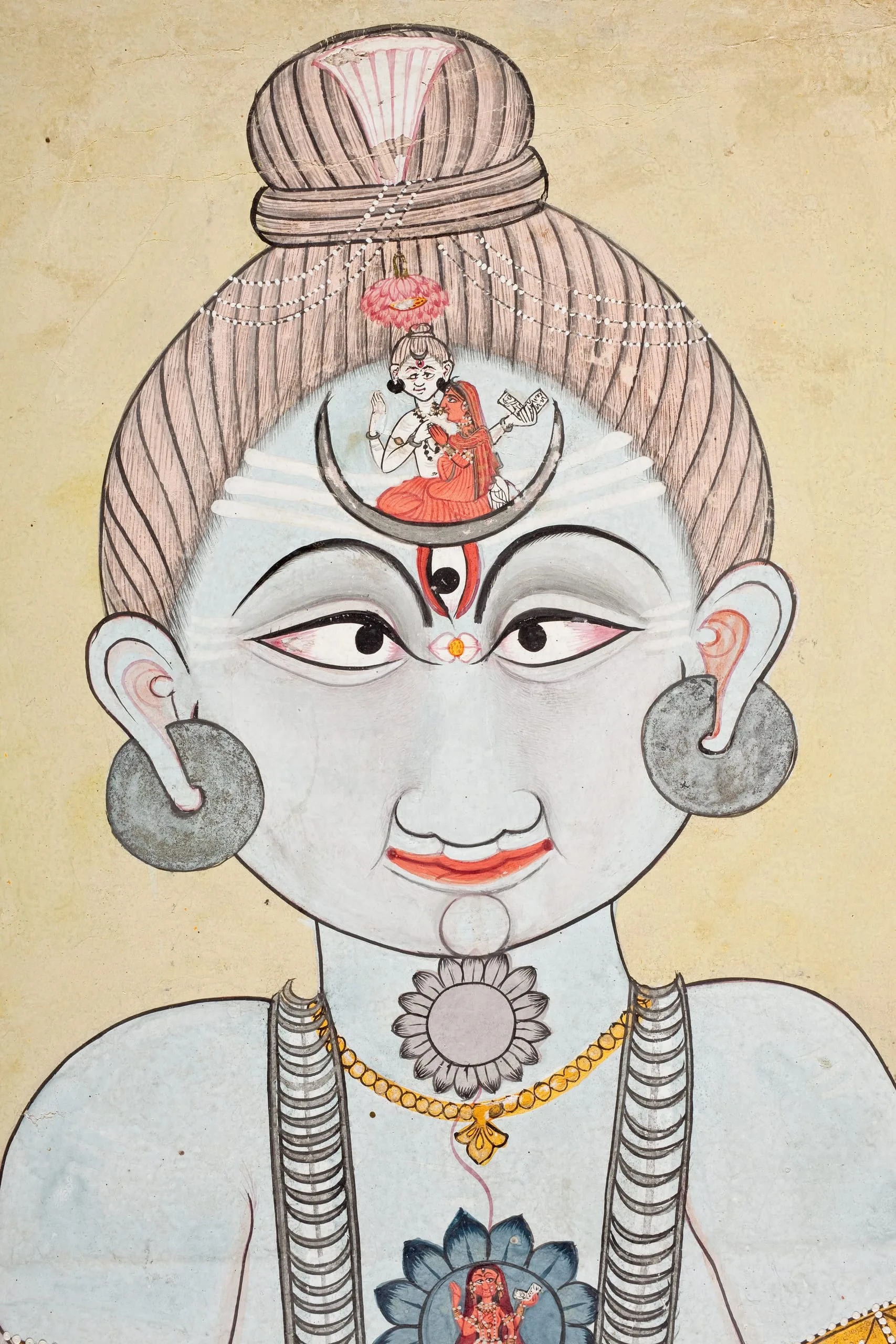 This is a representation of a Nath yogi seated in the “lotus posture” (padma asana) on a lotus base. His distinctive large round earrings are the special insignia of the kanphata [ear-split] ascetics, a tantric Shaiva sect founded by the great Hindu saint and teacher Gorakhnath who most likely lived in eastern Bengal in the early 11th century. His Shaiva sectarian affiliation is indicated by his three horizontal forehead markings (tiryakpundra). Along his vertical axis, there are seven chakras or energy centers of the subtle body (sukshma sharira). Each chakra represents a focal point for meditative visualizations intended to achieve a specific spiritual or physical attainment. Through Kundalini yoga, the energy that lies within the subtle body at the base of the spine is activated and channeled upward in a yogic process of transcendental perfection. In ascending order, the seven chakras illustrated here are the root chakra (muladhara), a coiled serpent personifying Kundalini energy within a triangular yantra; sacral chakra (svadhishthana), a six-petaled pink lotus; solar plexus chakra (manipura), a ten-petaled orange lotus; heart chakra (anahata), a twelve-petaled blue lotus with a four-armed goddess holding a sacred text; throat chakra (vishuddha), a sixteen-petaled gray lotus; third eye chakra (ajna), a four-armed Shiva and Parvati; and crown chakra (sahastrara), an upright white lotus. An image of a yogin with six chakras is in the National Museum, New Delhi (82.485).