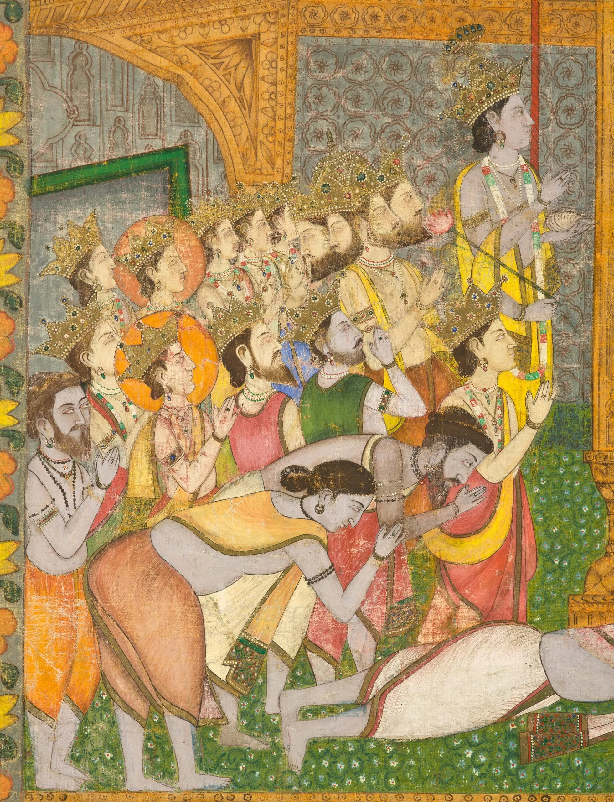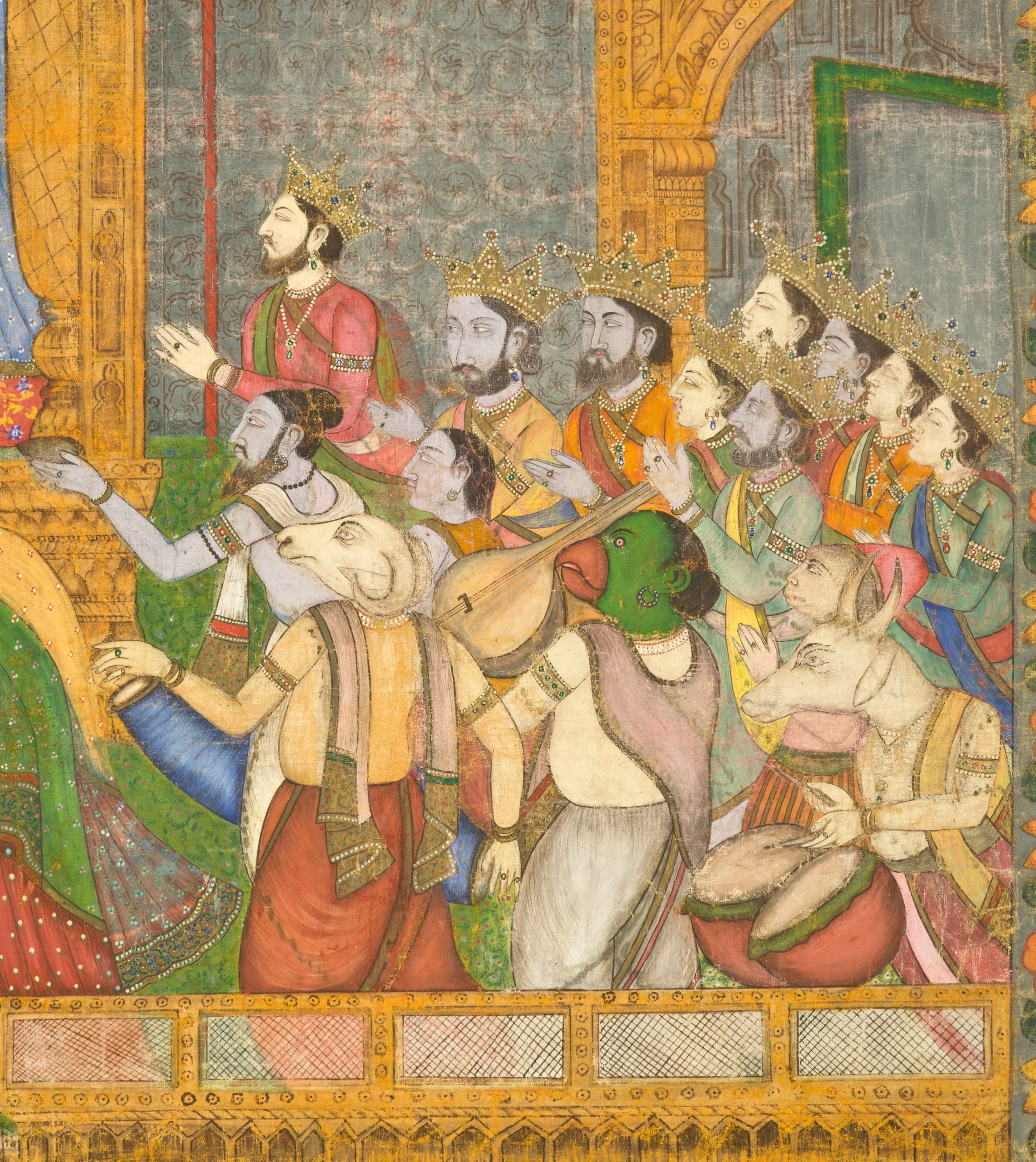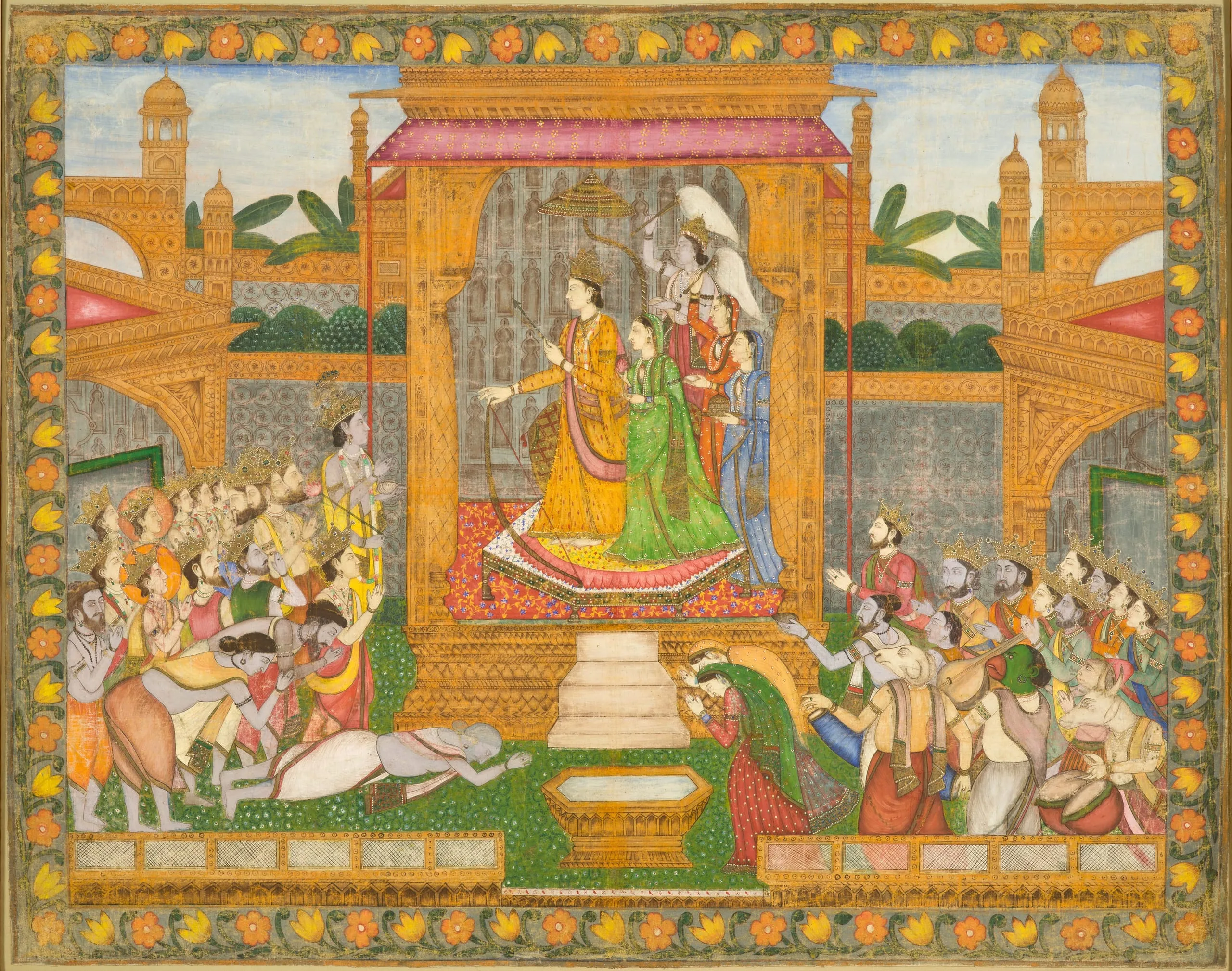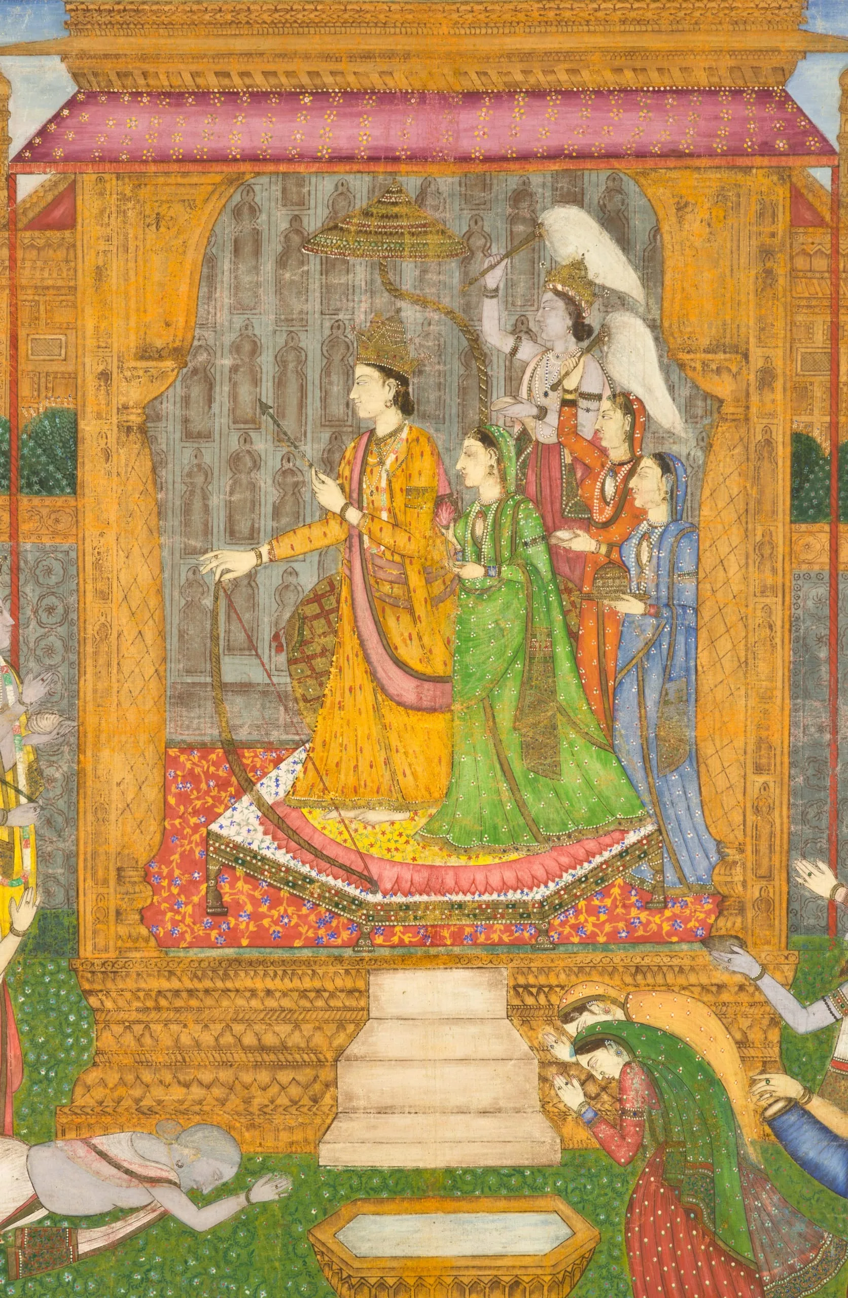 Here, Rama and Sita stand on a hexagonal dais under a bejeweled parasol inside a pavilion. The crowned Rama holds a bow and arrow and wears the customary Vaishnava yellow garb. Sita carries a lotus. Two attending figures wave honorific fly whisks made from the white tail-hairs of a yak (cauri or chowri). The crowned male attendant may represent Rama’s faithful brother Lakshmana. Two groups of worshippers comprise the audience. On the left are the four-armed Vishnu, the four-headed Brahma, the nimbate Sun-God Surya and Moon-God Chandra, other crowned deities, and ascetics. On the right are animal-headed celestial musicians (gandharvas), additional crowned figures and ascetics, and two women paying obeisance beside a large basin of water.