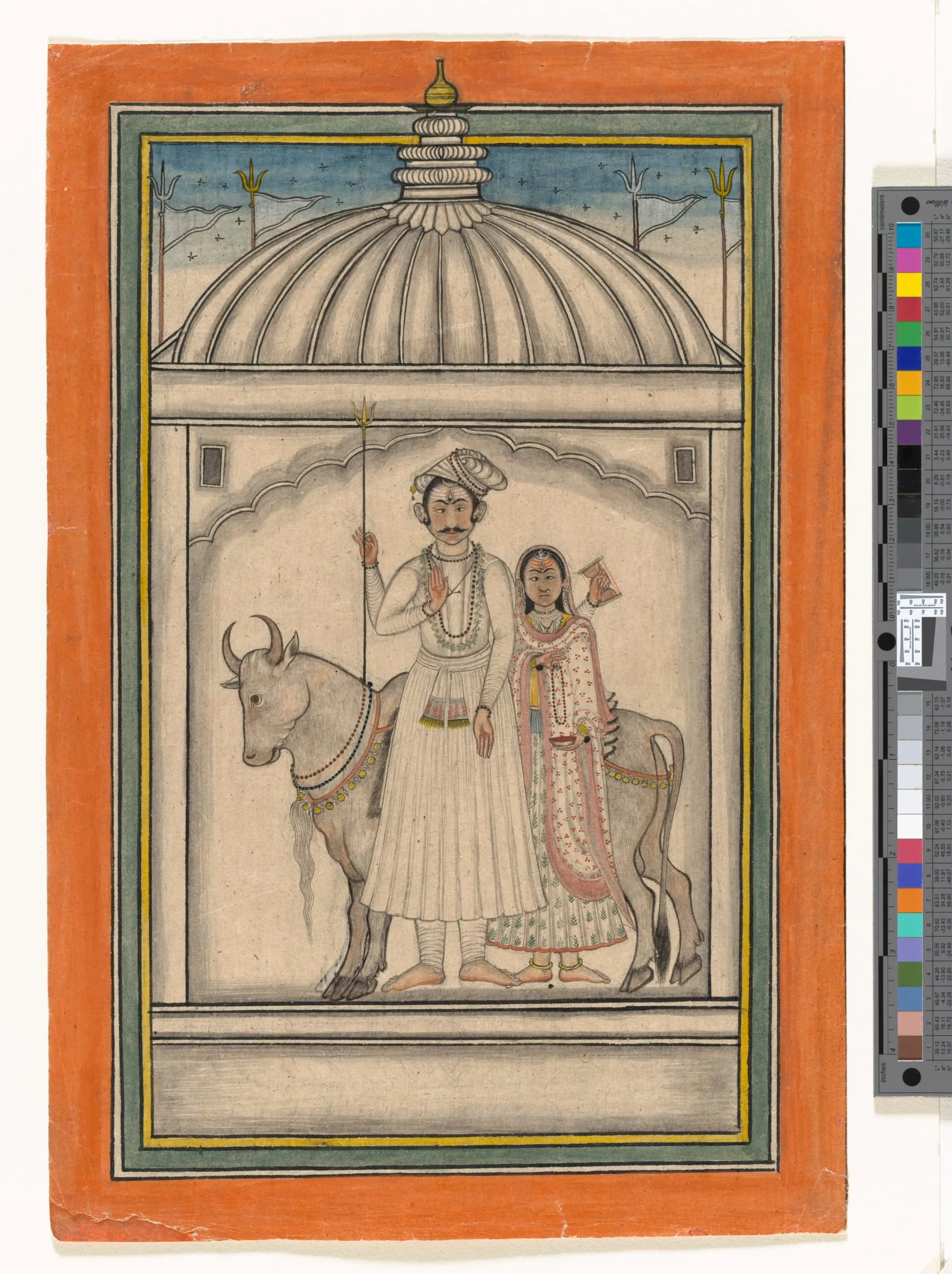 Shiva and Parvati stand in front of Shiva’s caparisoned bull mount, Nandi, under an arched doorway in a pavilion or temple adorned with Shiva’s trident standards. Shiva has a third eye of wisdom (jñananetra), and horizontal sectarian markings and his emblematic crescent moon on his forehead. He has four arms. His rear hands hold his trident and hourglass-shaped drum. His front hands are held in the symbolic gestures of ‘fear-not’ (abhaya mudra) and ‘gift-giving’ (varada mudra). He wears Rudraksha (eye of Rudra/Shiva) beads (elaeo carpus seeds) as his turban adornment, long necklace, and bracelets. He also wears a pine needle garland and a floral waist sash over his long white outer garment. Parvati has the same forehead adornments as Shiva and wears profuse jewelry. She holds a Rudraksha bead rosary and a bowl of bhang, Shiva’s favored intoxicating drink.