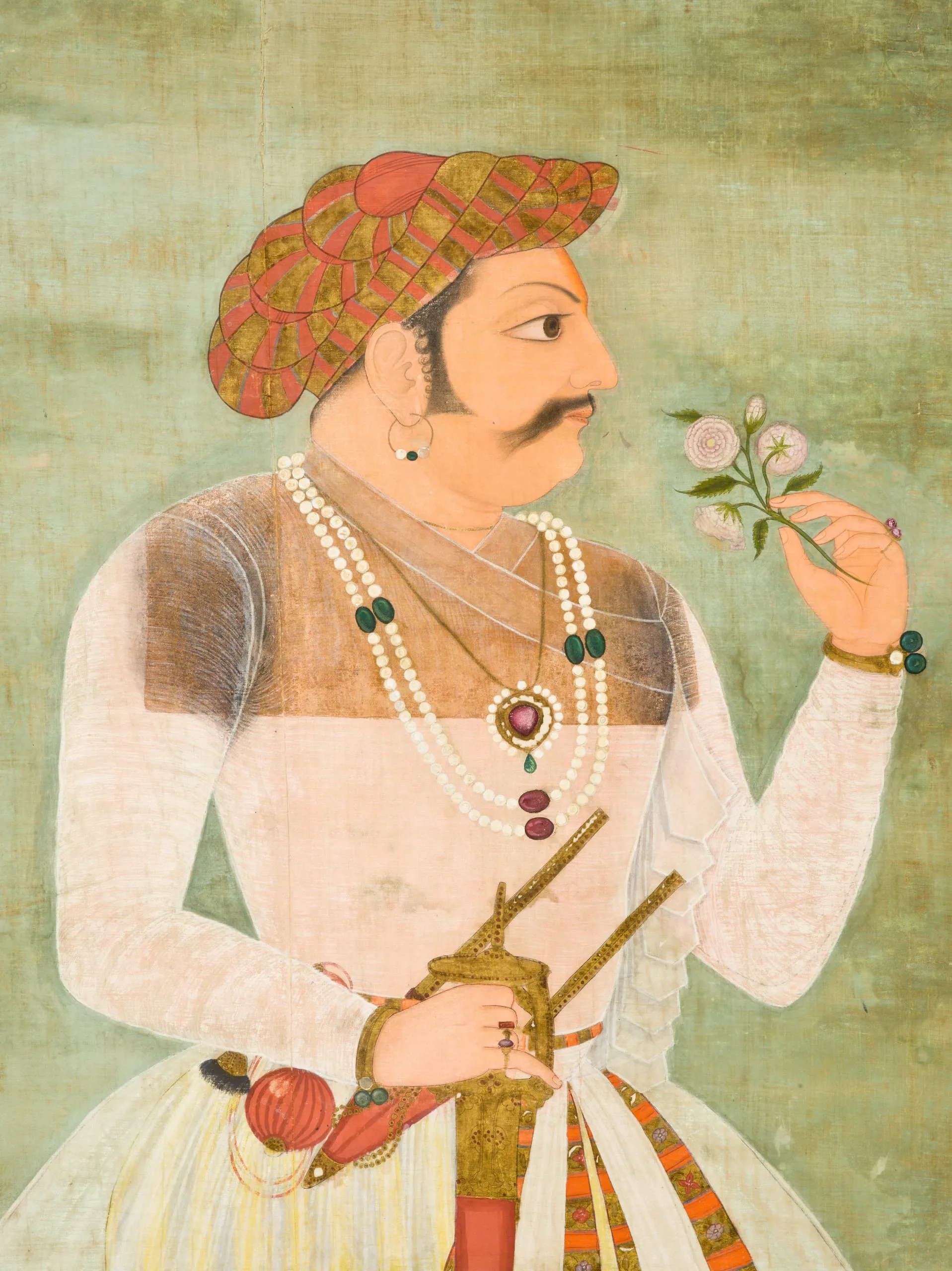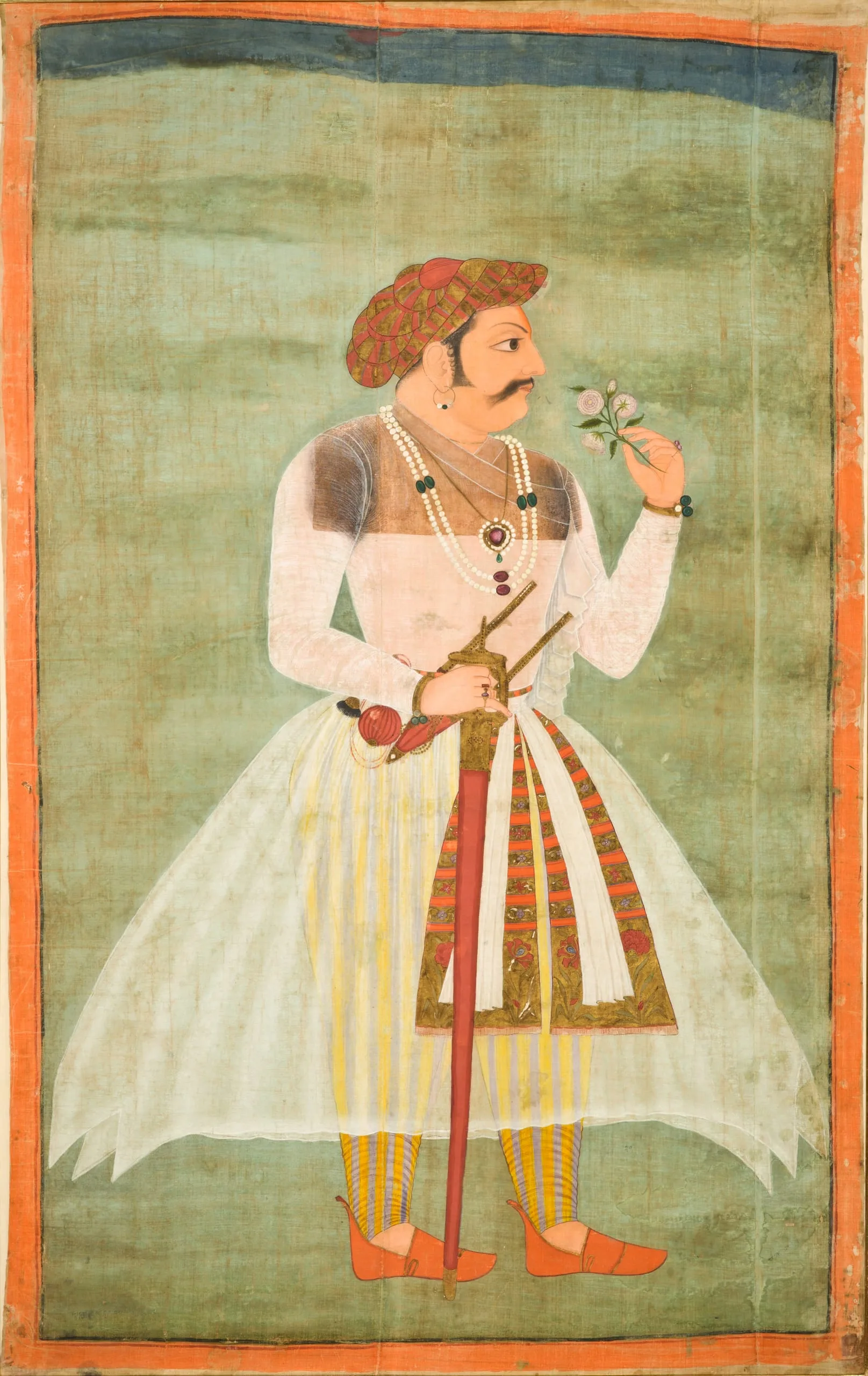 Jagat Singh I was the Maharana (Great King) of Mewar (r. 1628-1652). He was born in 1607 and ruled from the capital city of Udaipur, which was founded in 1568 shortly after the fall of Mewar’s first capital, Chitor, to the Mughal Emperor Akbar (r. 1556-1605). The dynasty’s long struggle against the Mughals was ended by Jagat Singh I’s grandfather, Maharana Amar Singh (r. 1597-1620), who submitted to Mughal suzerainty in 1615. Due to the favorable terms of his capitulation, Mewar entered a period of relative peace and prosperity in which art and architecture were actively cultivated. Jagat Singh I maintained a close relationship with the Mughal Emperor Shah Jahan (r. 1628-1658), who had once sought refuge in Udaipur during the reign of Jagat Singh I’s father, Karan Singh II (r. 1620-1628). Portraiture and court scenes had been popular in Mewar since the latter half of the 17th century, but it was under Maharana Ari Singh II (r. 1761-73) that large portraits of Mewar’s previous rulers became popular. A devanagari inscription on the reverse identifies the subject as the senior Maharana Jagat Singh to differentiate it from the later ruler, Maharana Jagat Singh II (r. 1734-1751). Jagat Singh I holds a nosegay as a symbol of cultural refinement. He has a punch dagger (katar) tucked in his waist sash. His right hand grasps the grip of a “Firangi” (European) straight sword. A comparable portrait of Maharana Kiran Singh (r. 1620-1628) is in the British Museum, London (1991,0131,0.1).