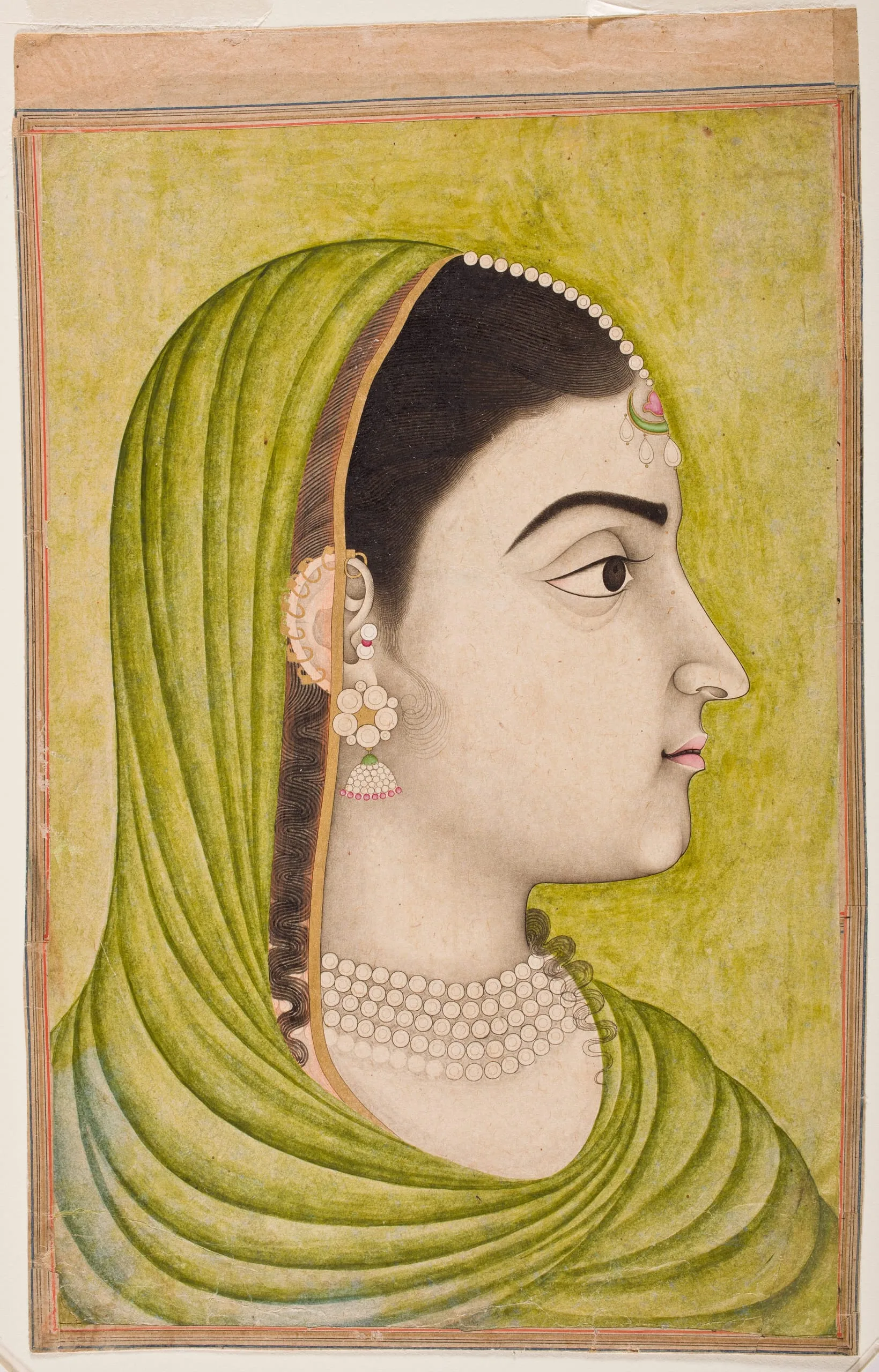 The unknown woman wearing a headscarf in this sensitive portrait can be identified as a Muslim by her jewelry. She wears a forehead ornament (mang tikka) with a green (emerald or enamel) crescent moon (hilal) and a red (ruby or enamel) star, symbolic of Islamic caliphal authority. It has pendant pearls and a pearl-strung support (mang patti) over the parting line of the hair to the top of the head. Along the perimeter of the ear are eight (or sometimes ten or twelve) small gold hoop earrings (bali) often worn by Muslim women. In her ear lobe is a non-sectarian northern Indian earring (karanphul jhumka, “ear flower earring”) consisting of a gold roundel with a pearl border and, suspended by a green enamel fitting, a dome-shaped pendant with a cluster of pearls and rubies. She also has a pearl-and-ruby ear stud. Around her neck are five strands of pearls.