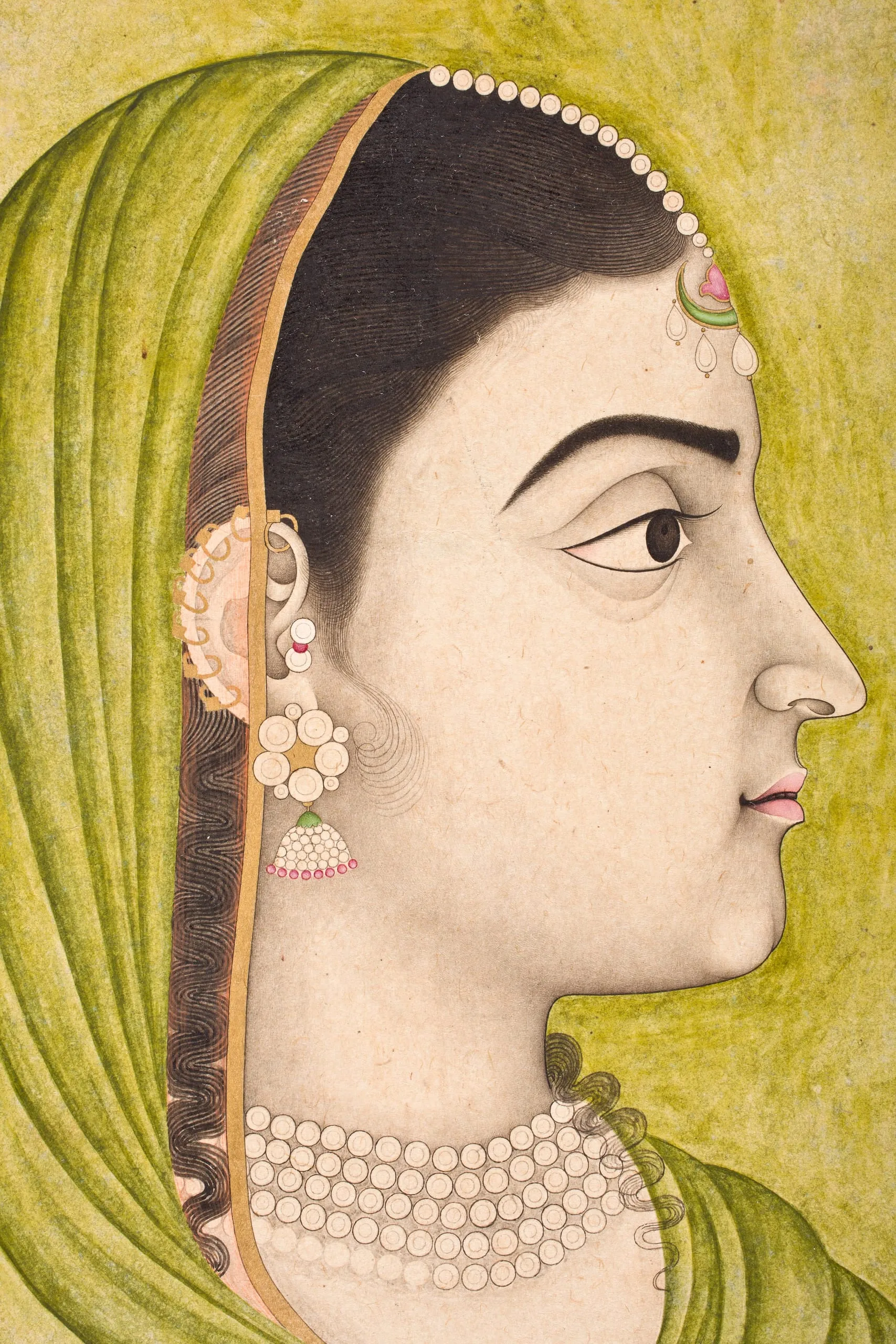 The delicate shading and anatomical accuracy of this Bikaner portrait is stylistically derived from 17th-century Mughal realistic portraiture. Whereas the Mughal emperors and Rajput kings are often recognizable as individuals with idiosyncratic features, their queens and princesses are usually stereotypical depictions, reflecting the severe cultural restrictions on the public appearance of high-status women in both Islamic and Hindu society. Thus, this realistic portrait may be a highly refined courtesan (tawaif) employed by elite patrons as singers, dancers, thespians, and teachers of social etiquette. See also M.2001.103.