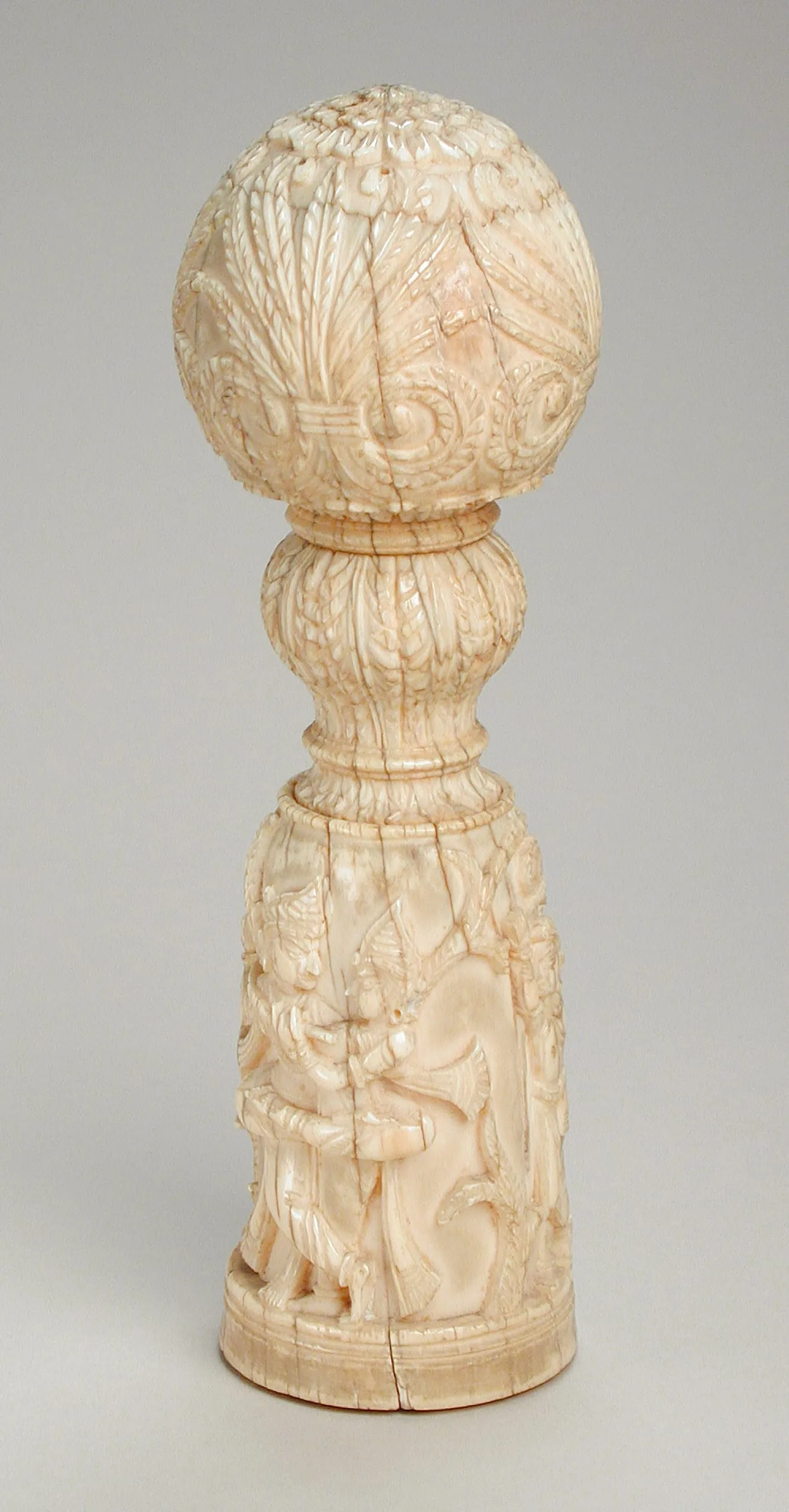 Presumably one of a set of four, this ornamental bedpost has a cylindrical base with figural scenes, a bulbous neck with circular moldings and pendent foliage, and a spherical finial with large palmettes with curled volutes carved on the sides and crowned with a carnation blossom. On the side of the base visible in the photograph, Krishna and Radha are embracing in a contortionist pose. Krishna stands on his right tiptoes with his left leg held horizontally and bent at the knee to encompass Radha, who stands pressed against him. Krishna's left arm encircles Radha’s shoulder, and his hand holds his rapturous flute. The divine couple wear conical crowns, conventional jewelry, and billowing scarves.