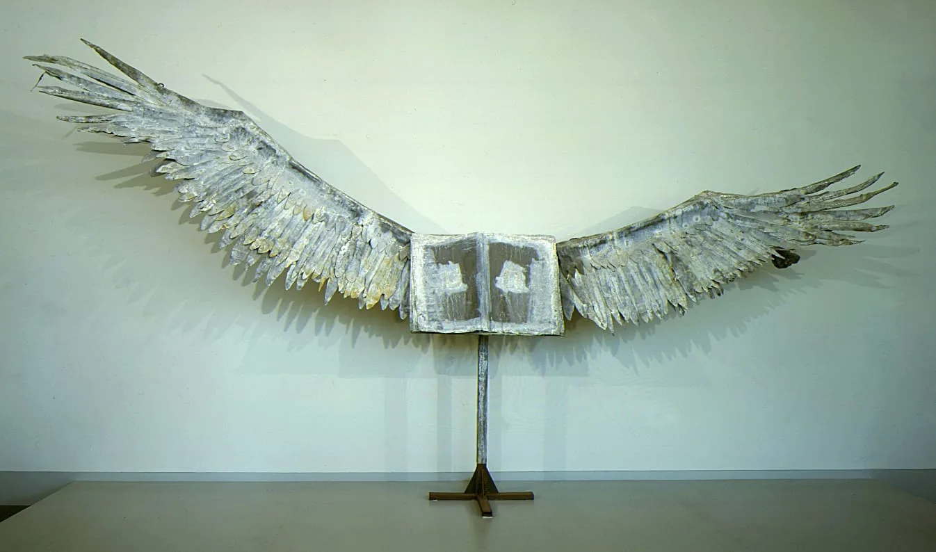 Born in 1945, [Anselm Kiefer] is a major figure among the post-World War II generation who returned to the tradition of figurative painting after the rise of conceptual art and other experimental mediums. He investigates themes of nationality and identity through the use of recurring symbolic and mythological references. His early work included performative elements, and he has created a small number of artist's books and sculptures that incorporate unusual components such as metal and straw. Kiefer is best known for his paintings. Das Buch (1980) is one of his few sculptures. It is composed of a monumental span of wings attached to an oversized book-two recurring motifs in his work. The wings may allude to the myth of Icarus (who fell to his death when he flew too close to the sun and melted the wax that held his wings together), while the book for Kiefer often symbolizes the Jewish people (often referred to as "The People of the Book"). Linked as they are here, the wings and the book constitute a powerful metaphor for the aspirations and the tragedy of the Jewish people in the twentieth century. The work embodies Kiefer's ongoing critique of German nationalism and its aftermath.