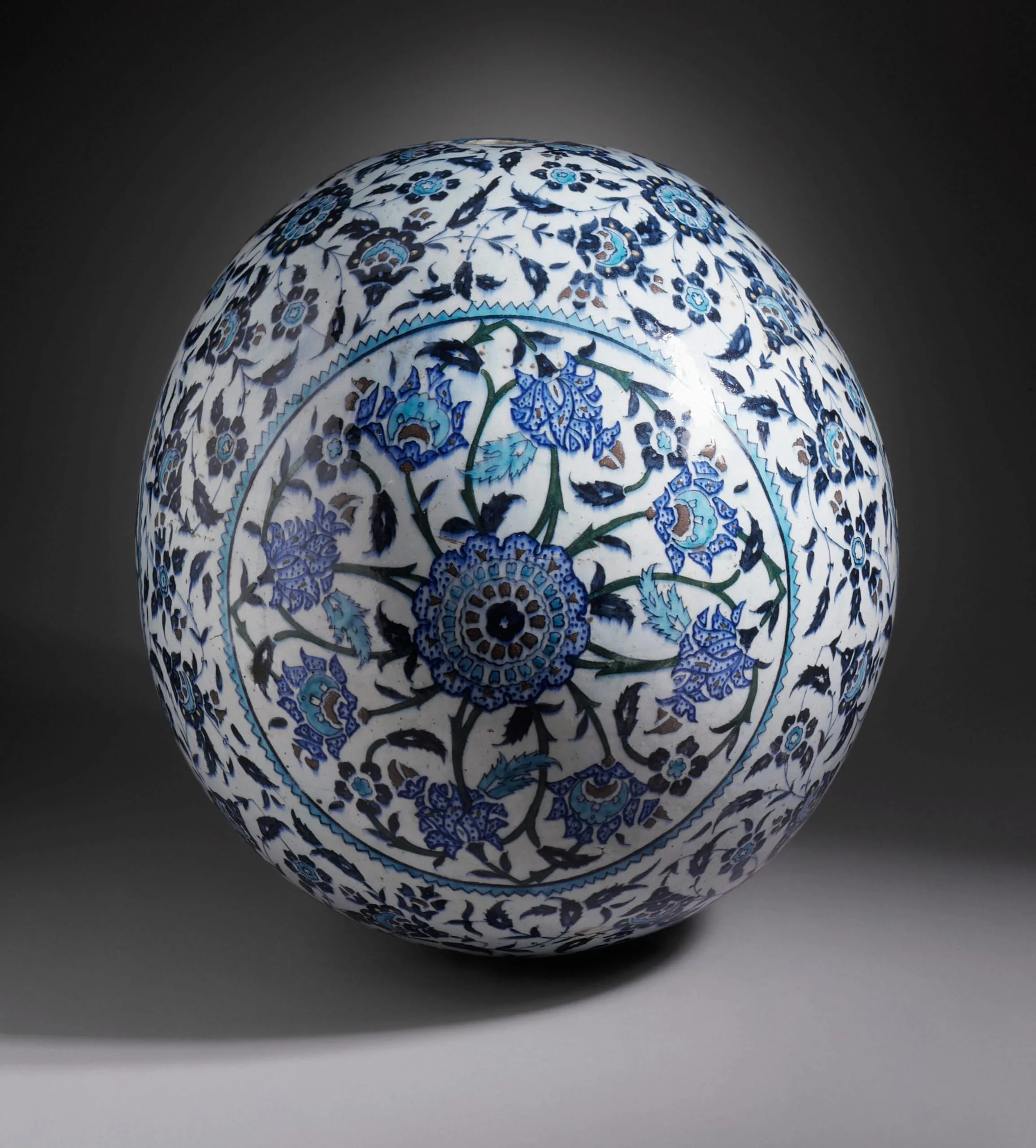 Adorned in blue and turquoise patterns of stylized flowers on saz-leaf vines, the surface of this spherical ornament recreates the most iconic designs associated with Iznik ceramics from the Ottoman empire during the mid-sixteenth century. Yet, in actuality, this work originates from a much later period of production. During the late nineteenth century to early twentieth, Armenian ceramicists from Kütahya revived classic Iznik designs on a wide range of objects and tile revetments that found admirers among both Ottoman elites and wealthy Europeans.