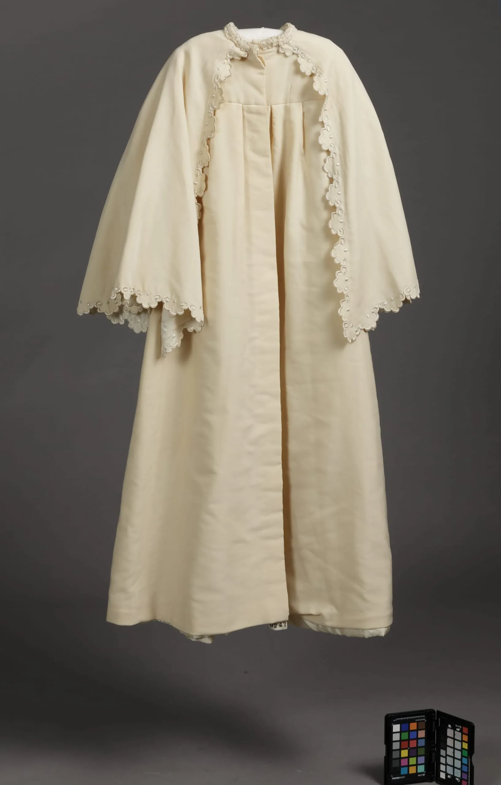 - Wool plain weave (broadcloth) with silk satin embroidery and silk plain weave (chiffon)